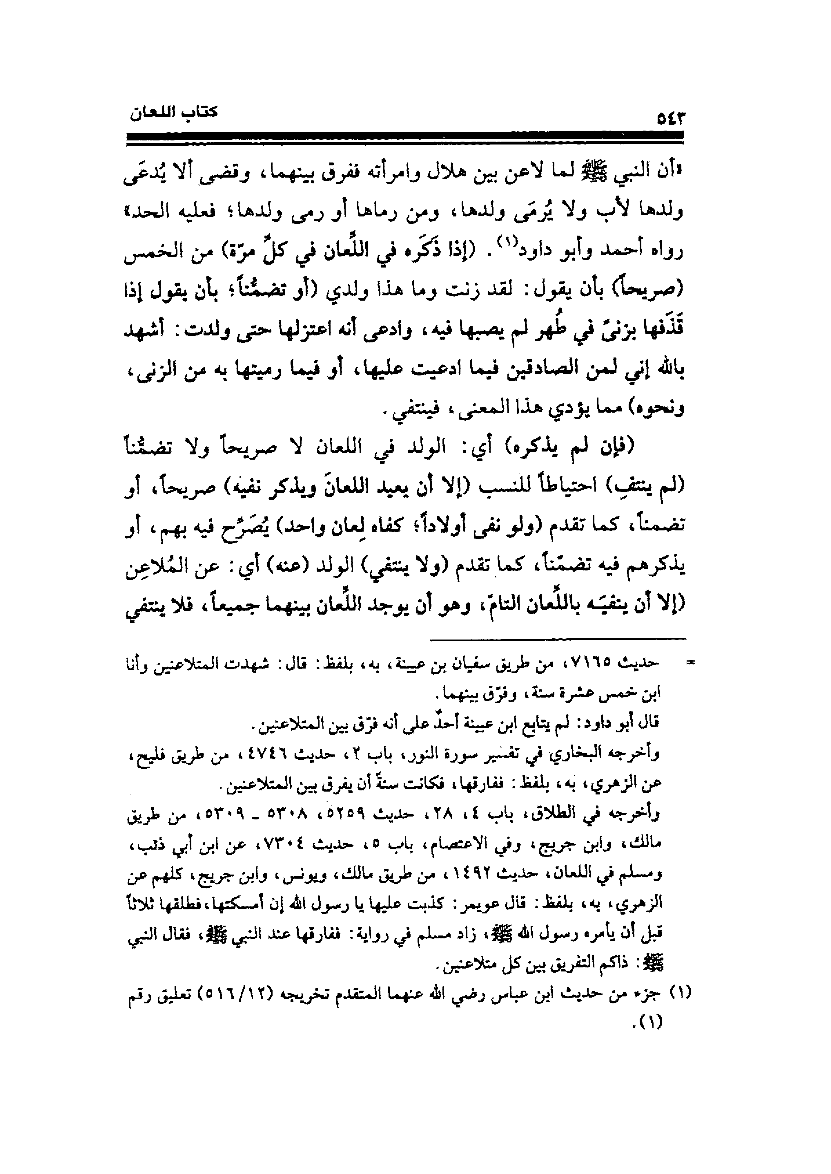 "أن النبي - صلى الله عليه وسلم - لما لاعن بين هلال وامرأته ففرق بينهما، وقضى ألا يُدعَى ولدها لأب ولا يُرمَى ولدها، ومن رماها أو رمى ولدها؛ فعليه الحد؛ رواه أحمد وأبو داود (¬١). (إذا ذَكَره في اللِّعان في كلِّ مرّة) من الخمس (صريحًا) بأن يقول: لفد زنت وما هذا ولدي (أو تضمُّنًا؛ بأن يقول إذا قَذَفها بزنىً في طُهر لم يصبها فيه، وادعى أنه اعتزلها حتى ولدت: أشهد بالله إني لمن الصادقين فيما ادعيت عليها، أو فيما رميتها به من الزنى، ونحوه) مما يؤدي هذا المعنى، فينتفي.