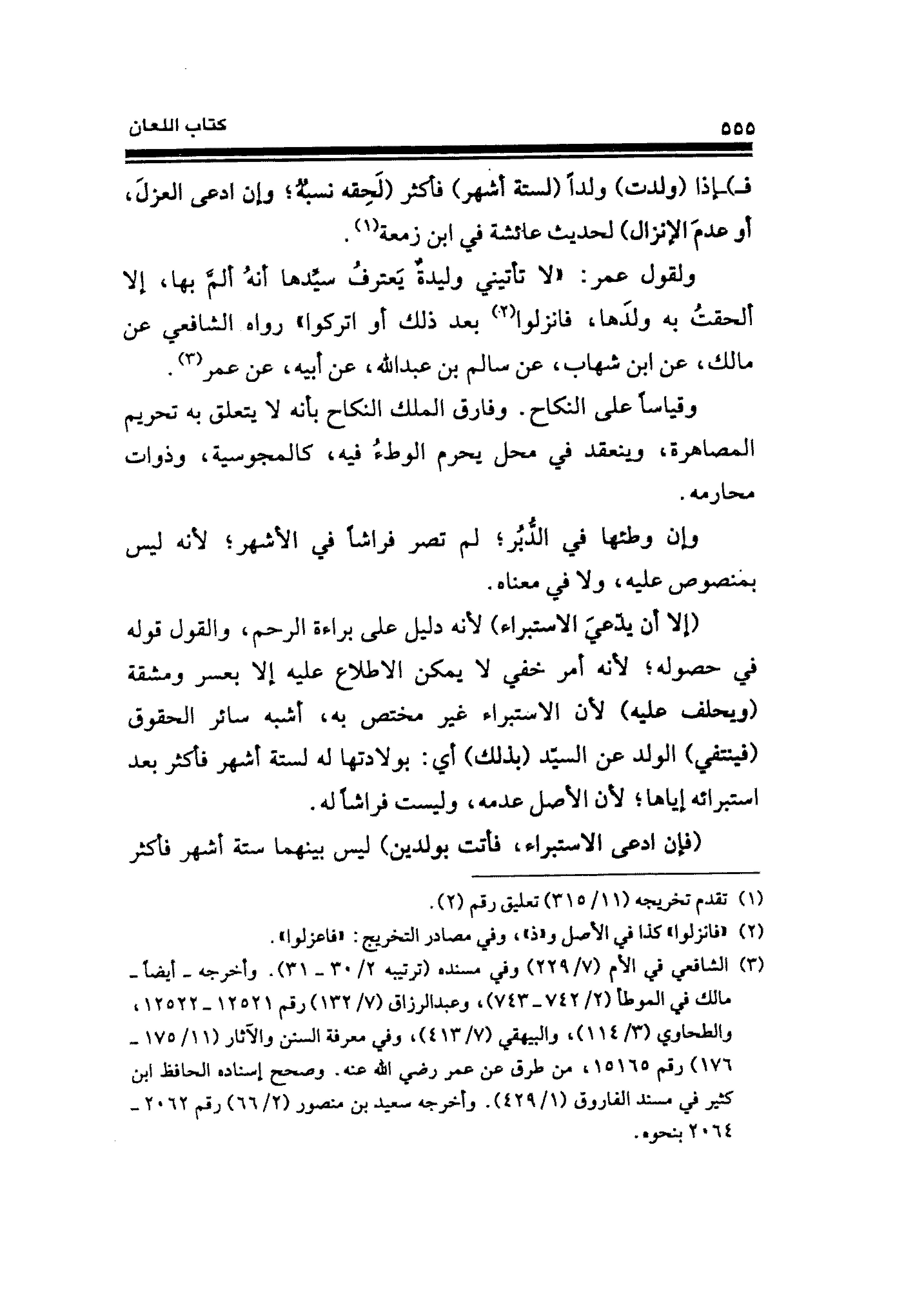 ولقول عمر: "لا تأتيني وليدةٌ يعترفُ سيِّدها أنهُ ألمَّ بها، إلا ألحقتُ به ولدها، فأنزلوا (¬٢) بعد ذلك أو اتركوا" رواه الشافعي عن مالك، عن ابن شهاب، عن سالم بن عبد الله، عن أبيه، عن عمر (¬٣).
