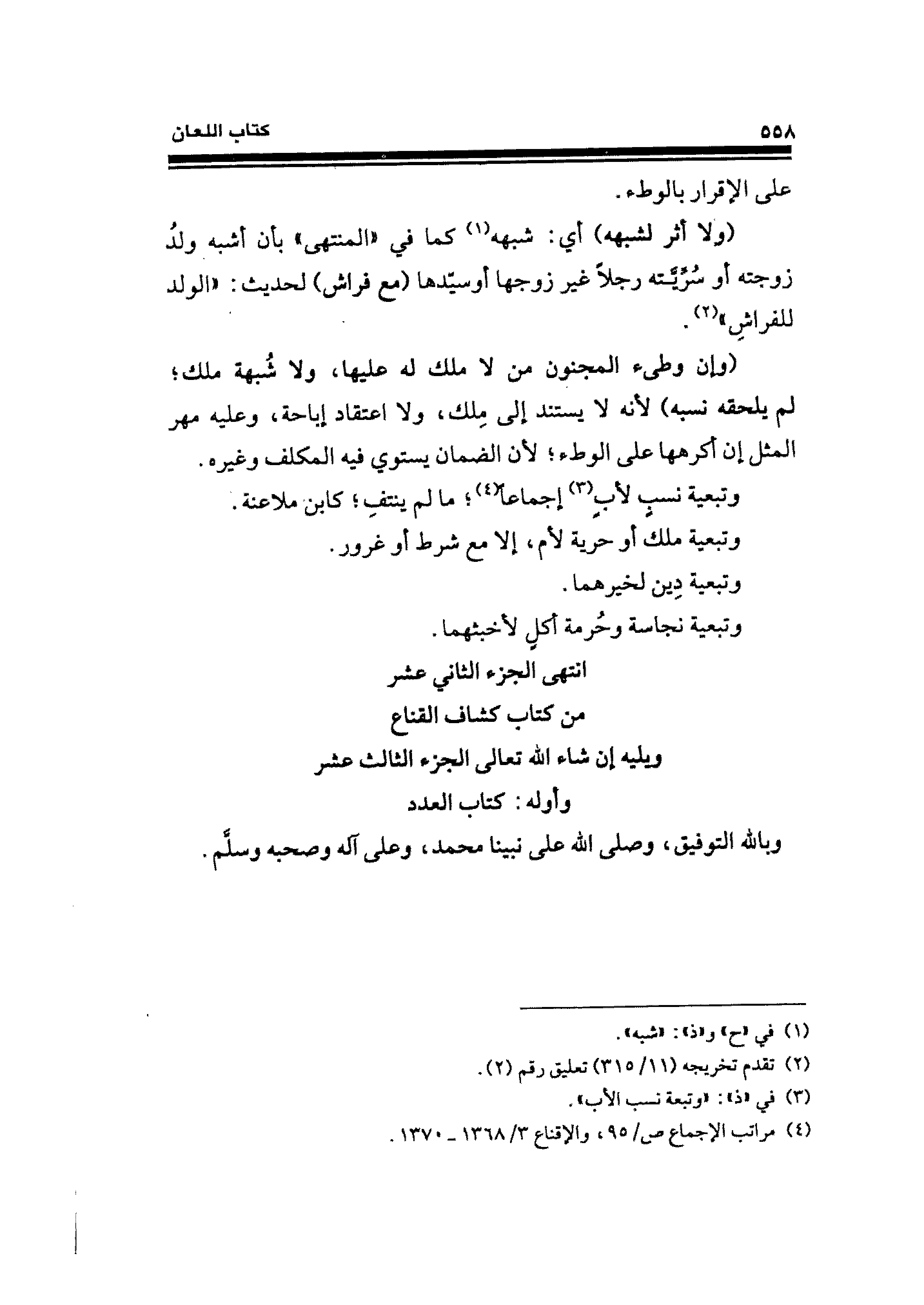 انتهى الجزء الثاني عشر من كتاب كشاف القناع ويليه إن شاء الله تعالى الجزء الثالث عشر وأوله: كتاب العدد