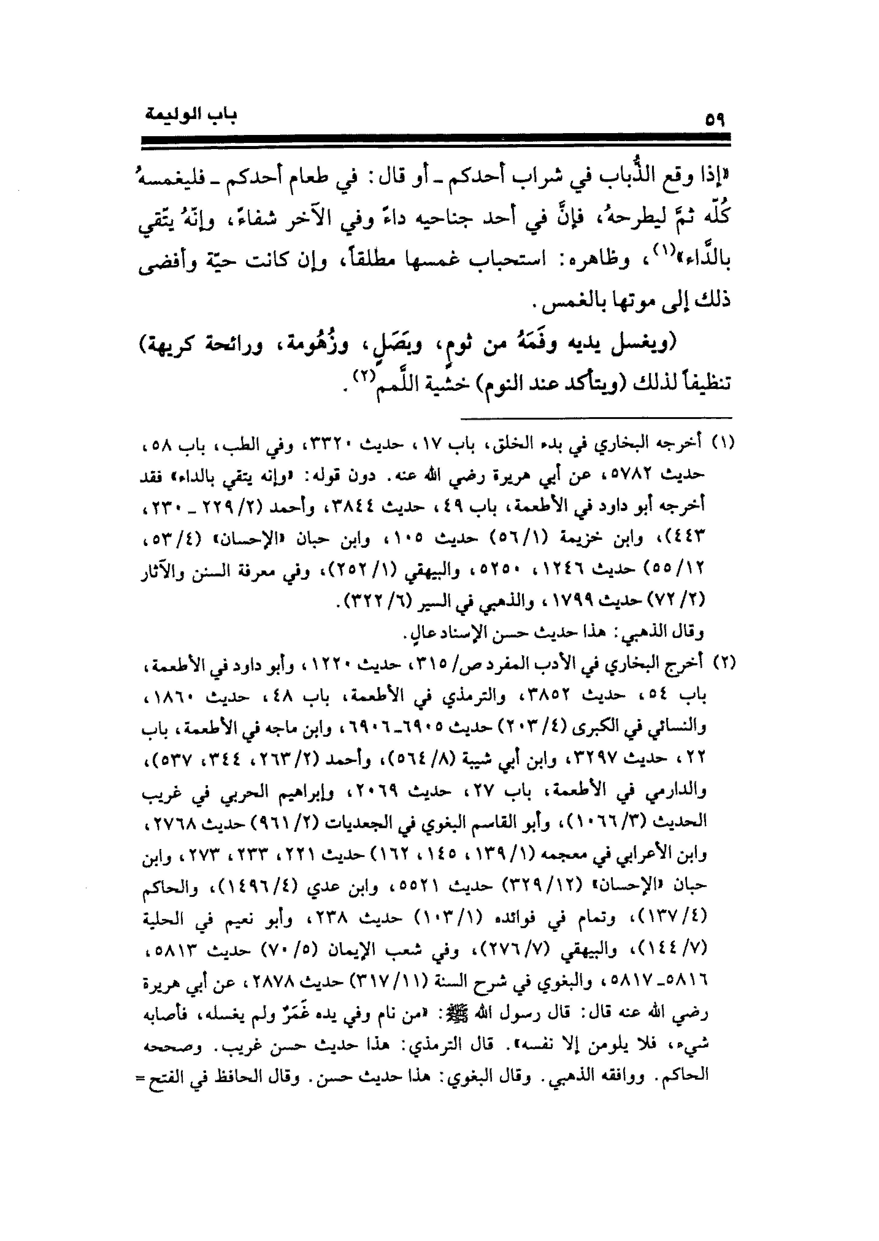 (¬٢) أخرج البخاري في الأدب المفرد ص / ٣١٥، حديث ١٢٢٠، وأبو داود في الأطعمة، باب ٥٤، حديث ٣٨٥٢، والترمذي في الأطعمة، باب ٤٨، حديث ١٨٦٠، والنسائي في الكبرى (٤/ ٢٠٣) حديث ٦٩٠٥ - ٦٩٠٦، وابن ماجه في الأطعمة، باب ٢٢، حديث ٣٢٩٧، وابن أبي شيبة (٨/ ٥٦٤)، وأحمد (٢/ ٢٦٣، ٣٤٤، ٥٣٧)، والدارمي في الأطعمة، باب ٢٧، حديث ٢٠٦٩، وإبراهيم الحربي في غريب الحديث (٣/ ١٠٦٦)، وأبو القاسم البغوي في الجعديات (٢/ ٩٦١) حديث ٢٧٦٨، وابن الأعرابي في معجمه (١/ ١٣٩، ١٤٥، ١٦٢) حديث ٢٢١، ٢٣٣، ٢٧٣، وابن حبان "الإحسان" (١٢/ ٣٢٩) حديث ٥٥٢١، وابن عدي (٤/ ١٤٩٦)، والحاكم (٤/ ١٣٧)، وتمام في فوائده (١/ ١٠٣) حديث ٢٣٨، وأبو نعيم في الحلية (٧/ ١٤٤)، والبيهقي (٧/ ٢٧٦)، وفي شعب الإيمان (٥/ ٧٠) حديث ٥٨١٣، ٥٨١٦ - ٥٨١٧، والبغوي في شرح السنة (١١/ ٣١٧) حديث ٢٨٧٨، عن أبي هريرة رضي الله قال: قال رسول الله - صلى الله عليه وسلم -: "من نام وفي يده غَمَرٌ ولم يغسله، فأصابه شيء، فلا يلومن إلا نفسه". قال الترمذي" هذا حديث حسن غريب وصححه الحاكم. ووافقه الذاهبي وقال البغوي: هذا حديث حسن. وقال الحافظ في الفتح =