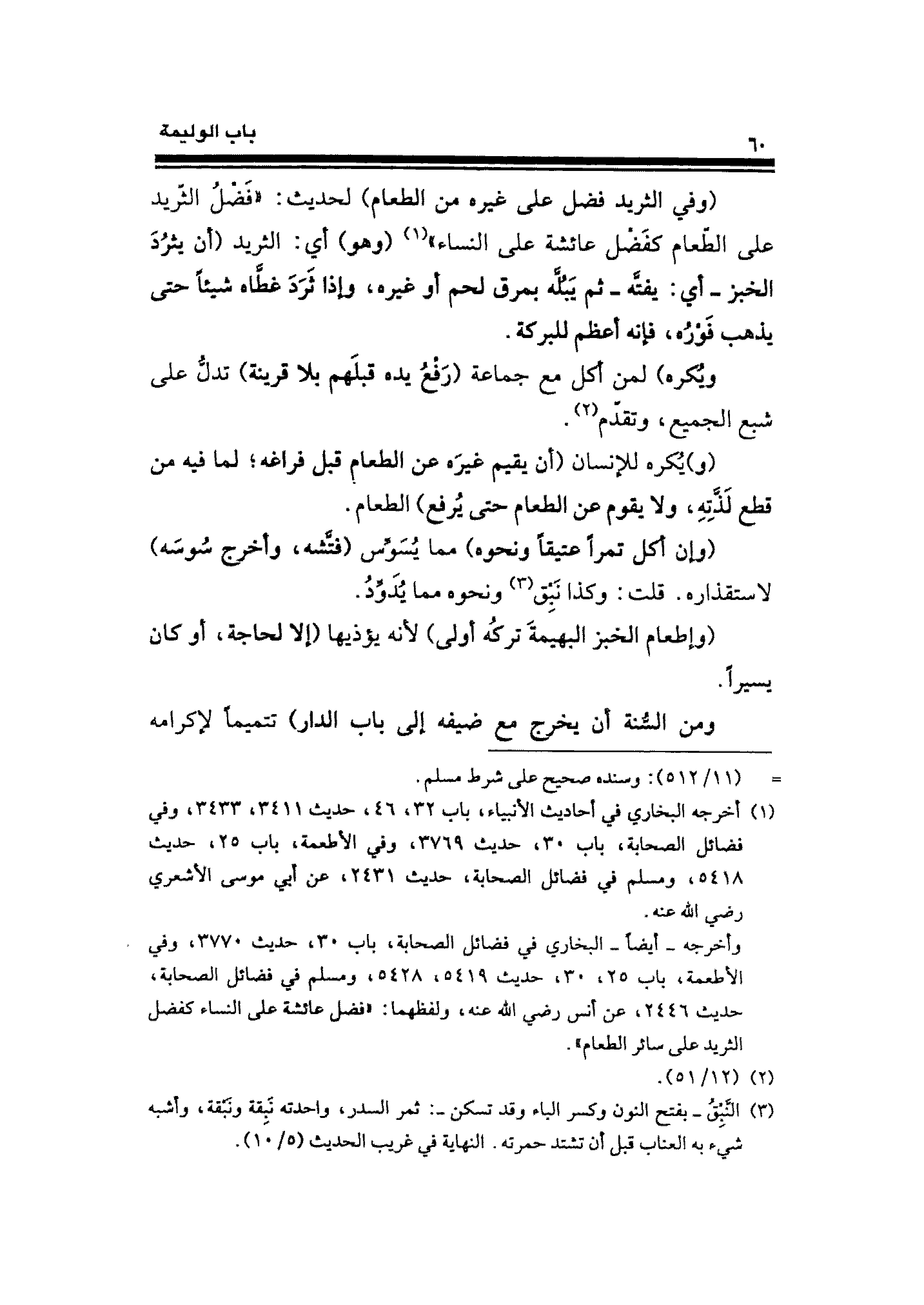 (وفي الثريد فضل على غيره من الطعام) لحديث: "فَضْلُ الثّريد على الطّعام كفَضْل عائشة على النساء" (¬١) (وهو) أي: الثريد (أن يثرُدَ الخبز -أي: يفتَّه- ثم يَبُلَّه بمرق لحم أو غيره، وإذا ثَرَدَ غَّطاه شيئًا حتى يذهب فَوْرُه، فإنه أعظم للبركة.