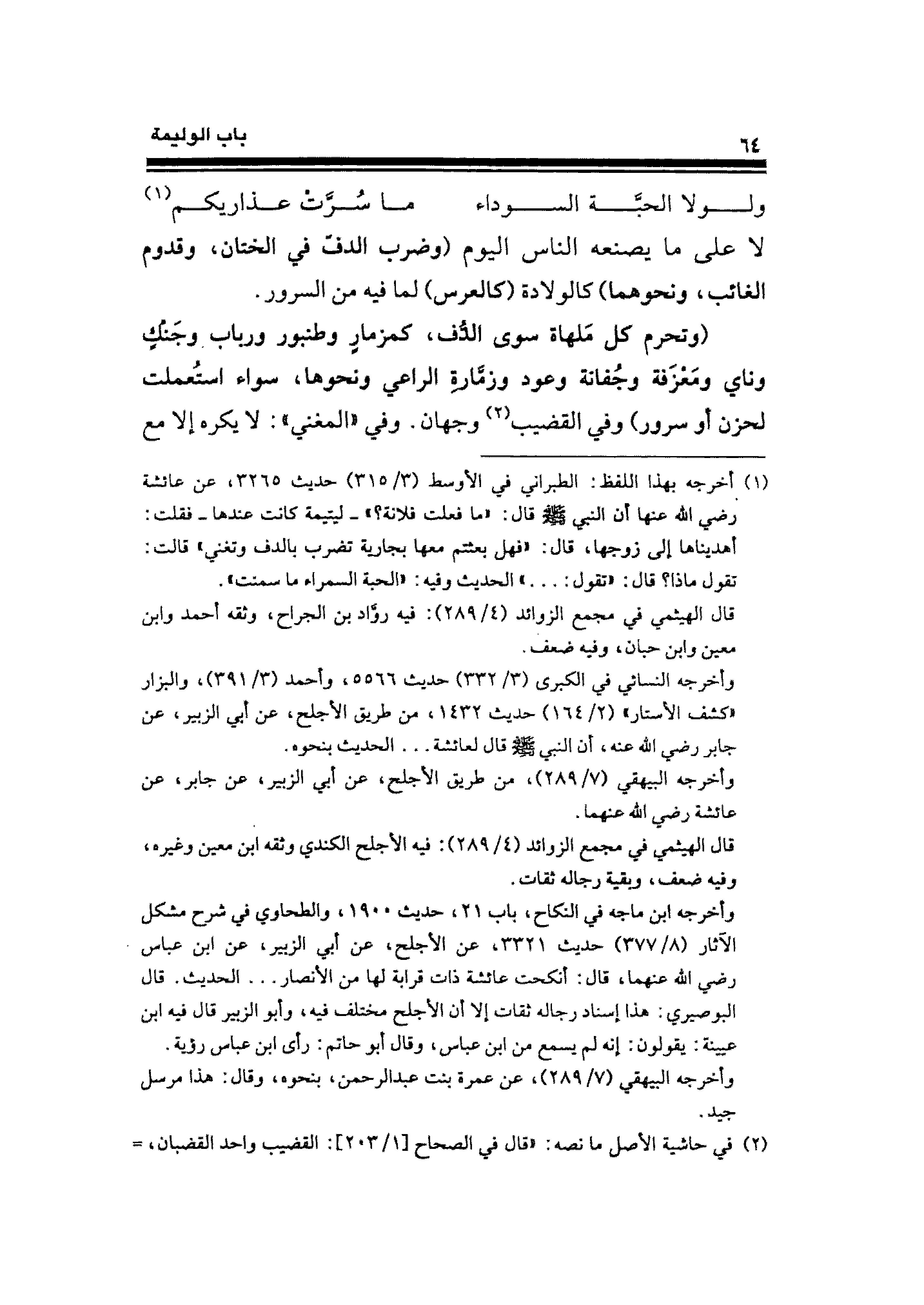 (¬١) أخرجه بهذا اللفظ: الطبراني في الأوسط (٣/ ٣١٥) حديث ٣٢٦٥، عن عائشة رضي الله عنها أن النبي - صلى الله عليه وسلم - قال: "ما فعلت فلانة؟ " -ليتيمة كانت عندها- فقلت: أهديناها إلى زوجها، قال: "فهل بعثتم معها بجارية تضرب بالدف وتغني" قالت: تقول ماذا؟ قال: "تقول: ... " الحديث وفيه: "الحبة السمراء ما سمنت".