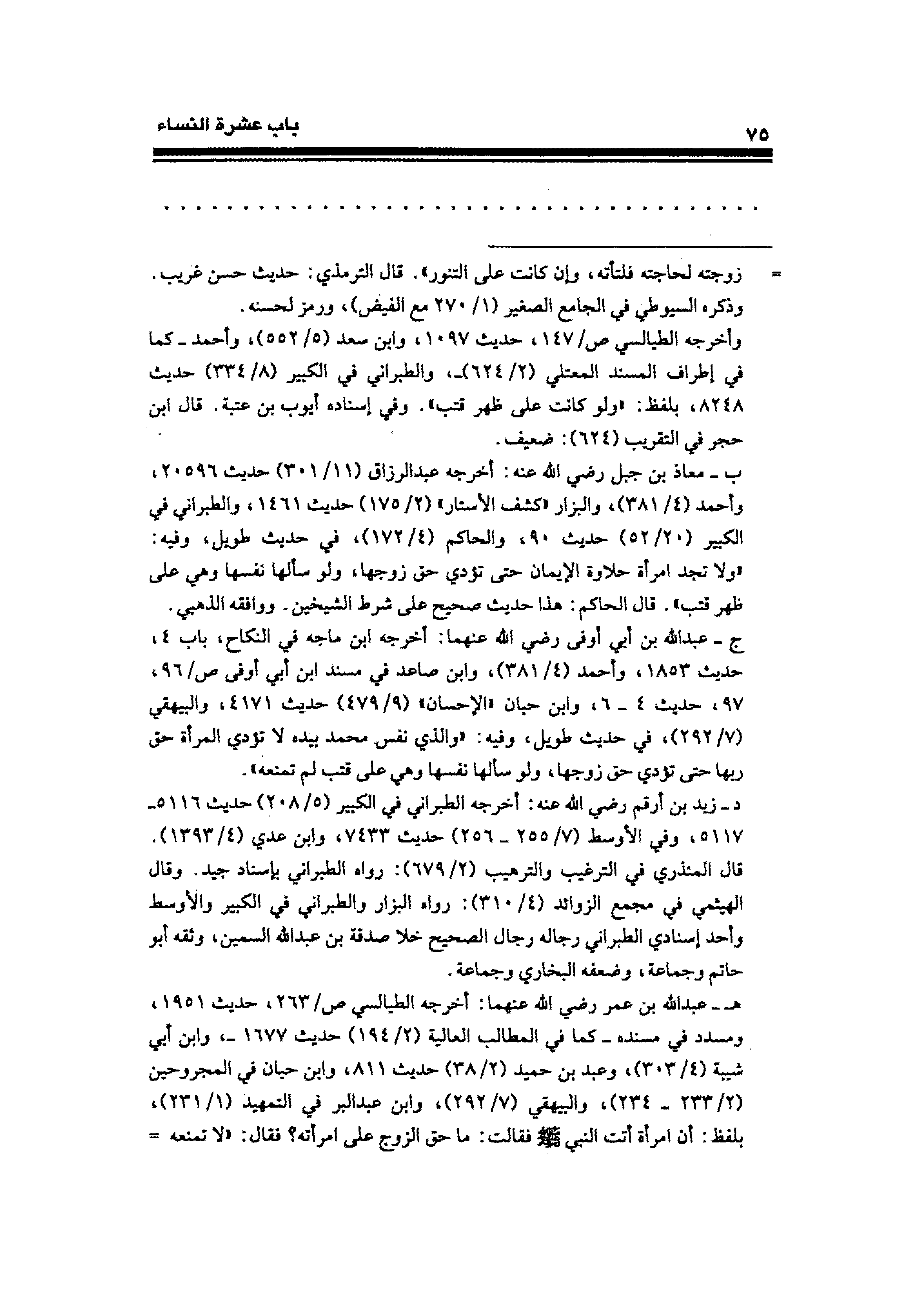 ج- عبد الله بن أبي أوفى رضي الله عنهما: أخرجه ابن ماجه في النكاح، باب ٤، حديث ١٨٥٣، وأحمد (٤/ ٣٨١)، وابن صاعد في مسند ابن أبي أوفى ص / ٩٦، ٩٧، حديث ٤ - ٦، وابن حبان "الإحسان" (٩/ ٤٧٩) حديث ٤١٧١، والبيهقي (٧/ ٢٩٢)، في حديث طويل، وفيه: "والذي نفس محمد بيده لا تؤدي المرأة حق ربها حتى تؤدي حق زوجها، ولو سألها نفسها وهي على قتب لم تمنعه".