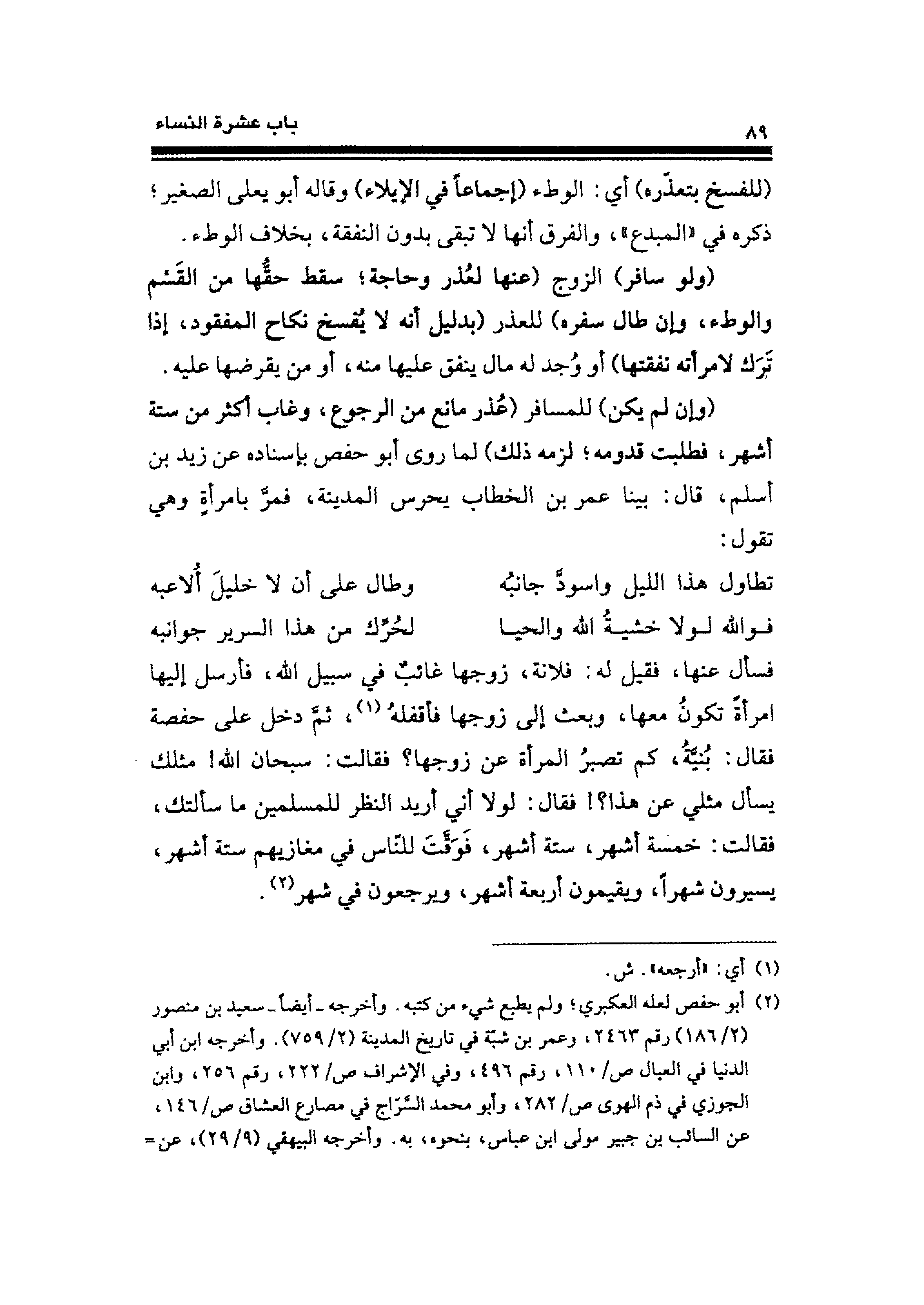 (وإن لم يكن) للمسافر (عُذر مانع من الرجوع، وغاب أكثر من ستة أشهر، فطلبت قدومه؛ لزمه ذلك) لما روى أبو حفص بإسناده من زيد بن أسلم، قال: بينا عمر بن الخطاب يحرس المدينة، فمرَّ بامرأةٍ وهي تقول: