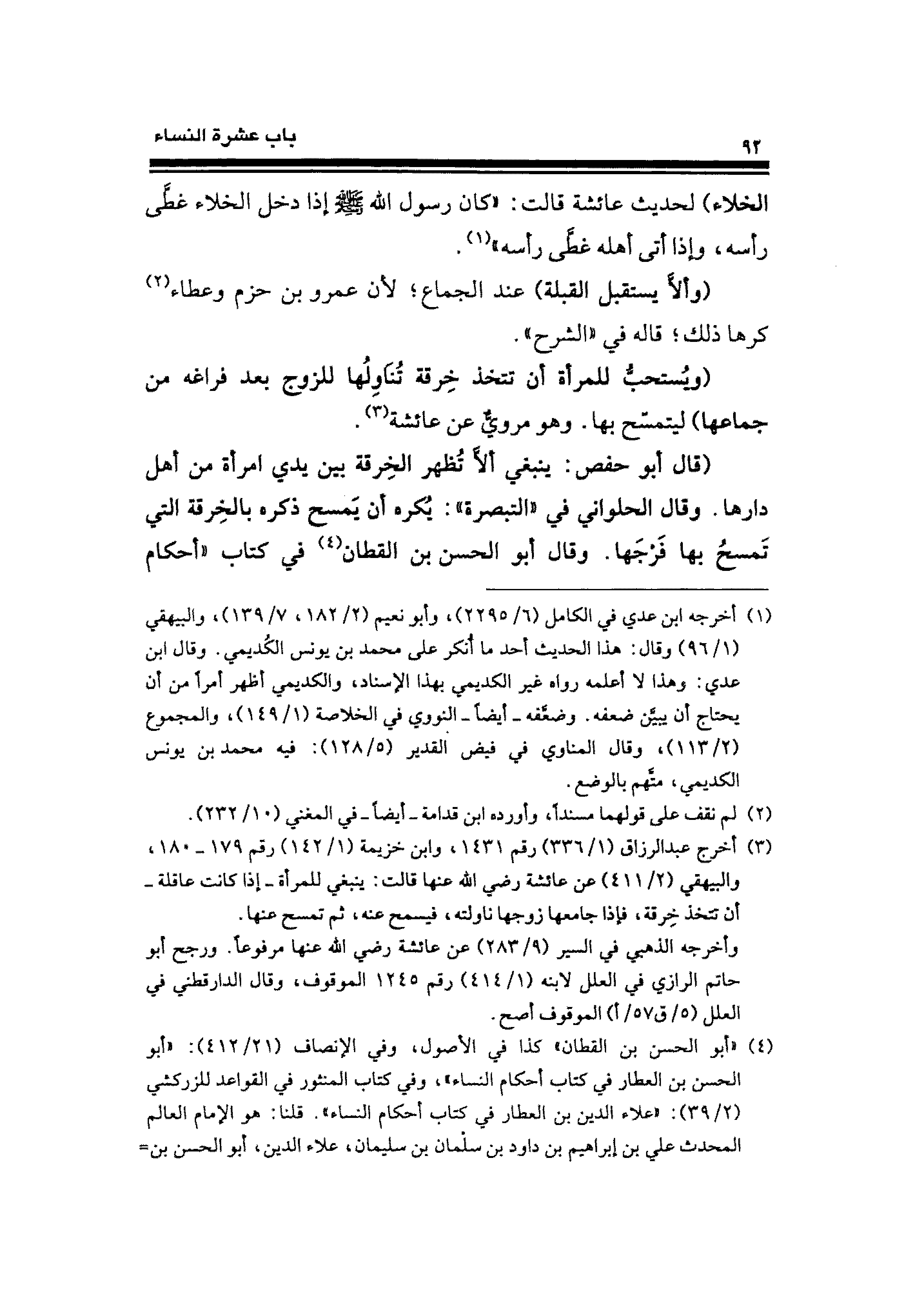 (¬٣) أخرج عبد الرزاق (١/ ٣٣٦) رقم ١٤٣١، وابن خزيمة (١/ ١٤٢) رقم ١٧٩ - ١٨٠، والبيهقي (٢/ ٤١١) عن عائشة رضي الله عنها قالت: يبقي للمرأة -إذا كانت عاقلة- أن تتخذ خِرقة، فإذا جامعها زوجها ناولته، فيمسح عنه، ثم تمسح عنها.