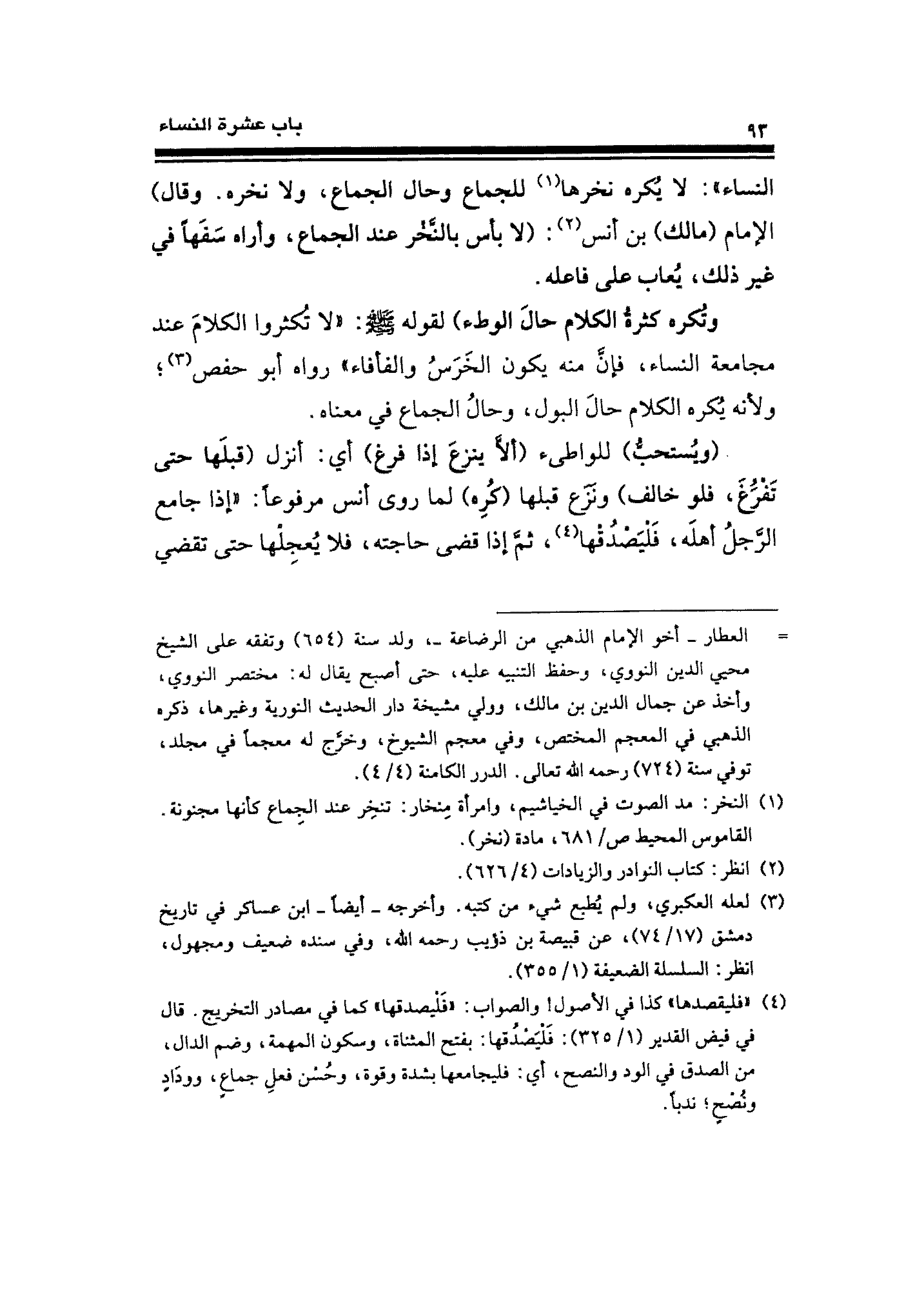 النساء": لا يُكره نخرها (¬١) للجماع وحال الجماع، ولا نخره. وقال) الإمام (مالك) بن أنس (¬٢): "لا بأس بالنَّخْر عند الجماع، وأراه سَفَهًا في غير ذلك، يُعاب على فاعله.