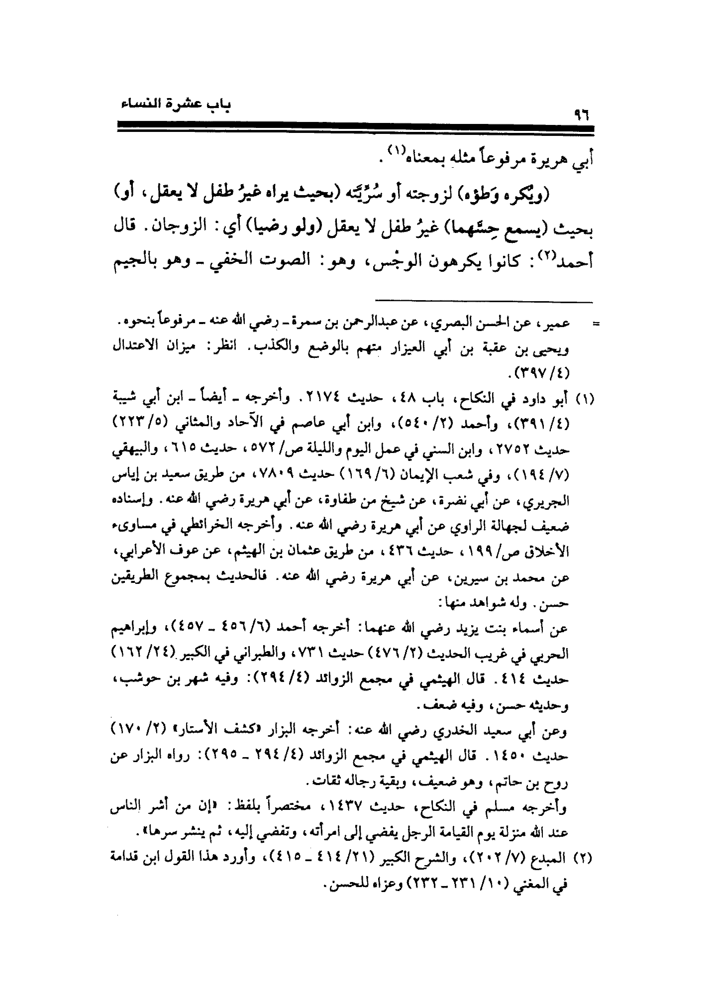 (ويُكره وَطؤه) لزوجته أو سُرِّيَّته (بحيث يراه غيرُ طفل لا يعقل، أو) بحيث (يسمع حِسَّهما) غيرُ طفل لا يعقل (ولو رضيا) أي: الزوجان. قال أحمد (¬٢): كانوا يكرهون الوجْس، وهو: الصوت الخفي -وهو بالجيم