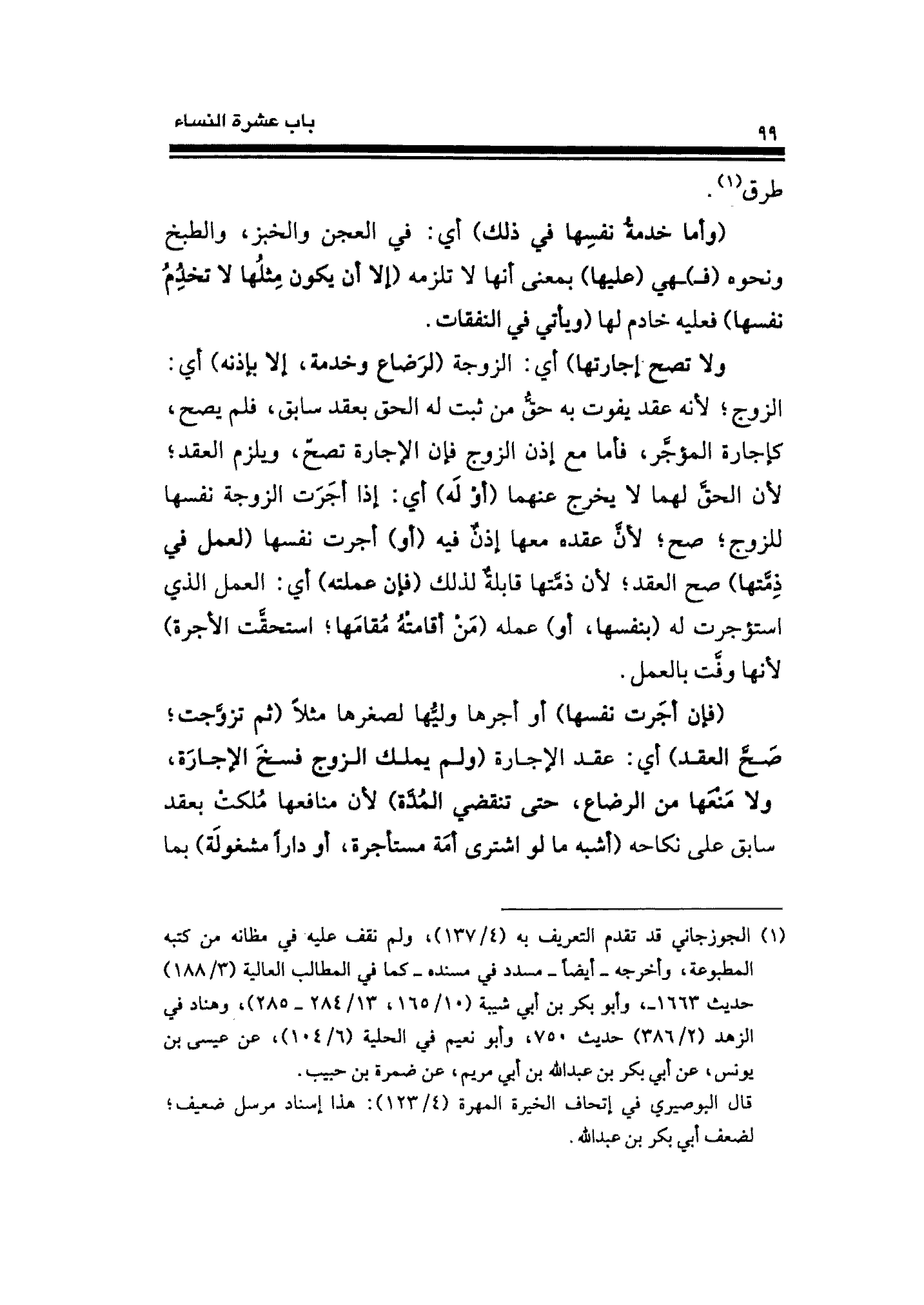 (وأما خدمةُ نفسِها فِي ذلك) أي: في العجن والخبز، والطبخ ونحوه (فـ) ـهي (عليها) بمعنى أنها لا تلزمه (إلا أن يكون مِثلُها لا تخدِمُ نفسها) فعليه خادم لها (ويأتي في النفقات.