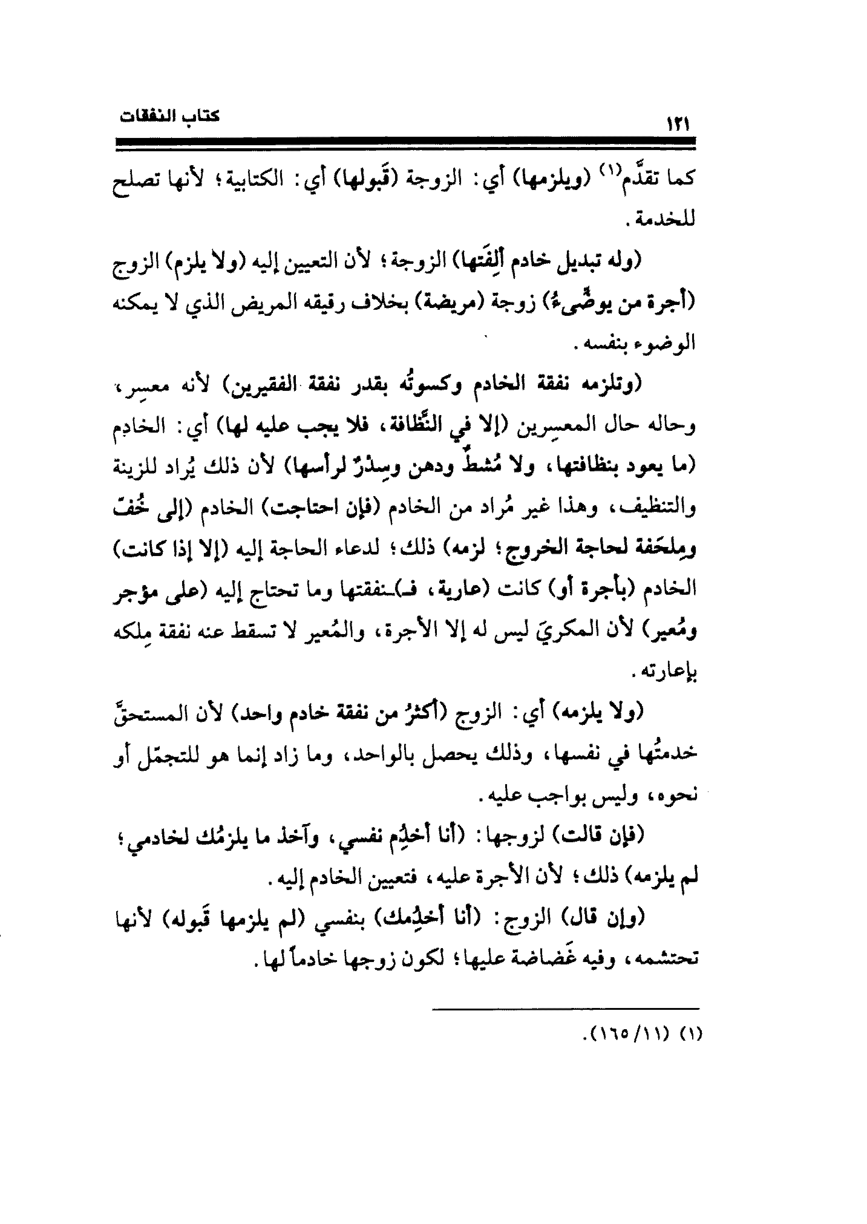 (وتلزمه نفقة الخادم وكسوتُه بقدر نفقة الفقيرين) لأنه معسِر، وحاله حال المعسِرين (إلا في النَّظافة، فلا يجب عليه لها) أي: الخادم (ما يعود بنظافتها، ولا مُشطٌ ودهن وسِدْرٌ لرأسها) لأن ذلك يُراد للزينة والتنظيف، وهذا غير مُراد من الخادم (فإن احتاجت) الخادم (إلى خُفّ ومِلحَفة لحاجة الخروج؛ لزمه) ذلك؛ لدعاء الحاجة إليه (إلا إذا كانت) الخادم (بأجرة أو) كانت (عارية، فـ) ـنفقتها وما تحتاج إليه (على مؤجر ومُعير) لأن المكريَ ليس له إلا الأجرة، والمُعير لا تسقط عنه نفقة مِلكه بإعارته.