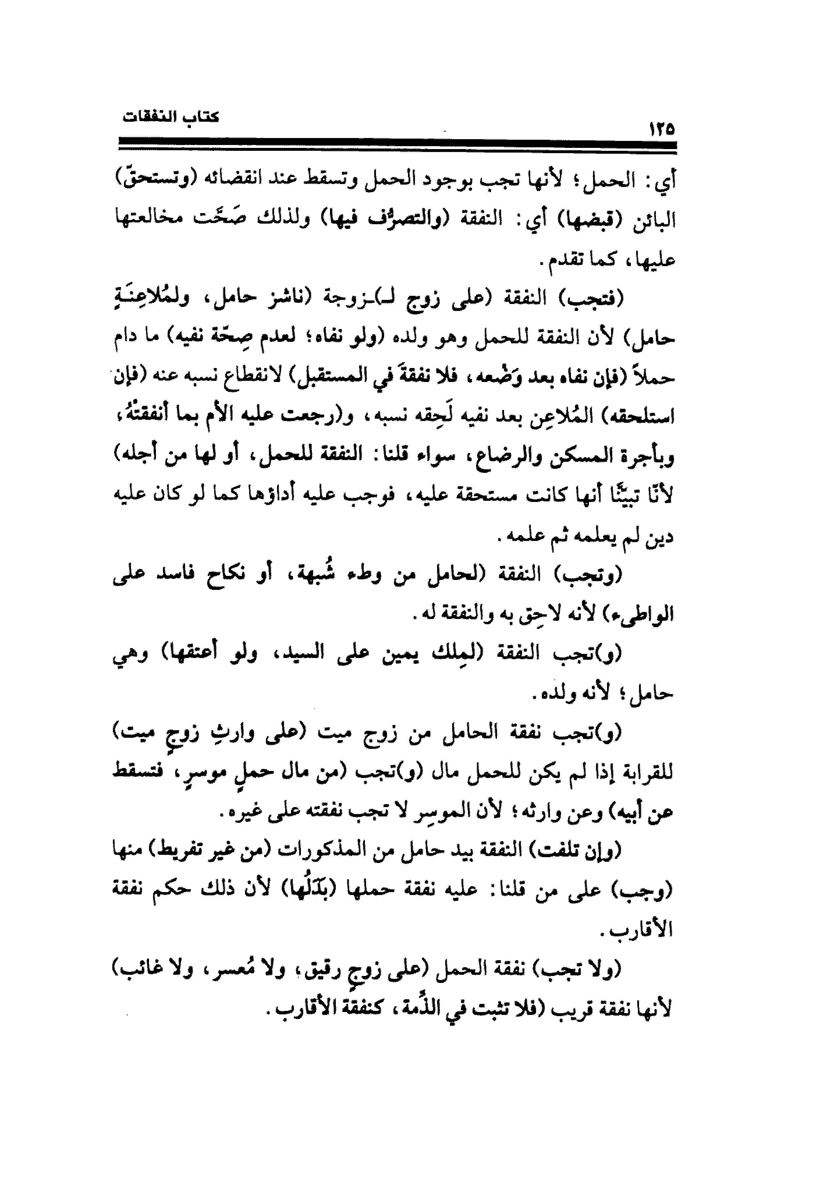 (ولا تجب) نفقة الحمل (على زوجٍ رقيق؛ ولا مُعسر، ولا غائب) لأنها نفقة قريب (فلا تثبت في الذِّمة، كنفقة الأقارب.