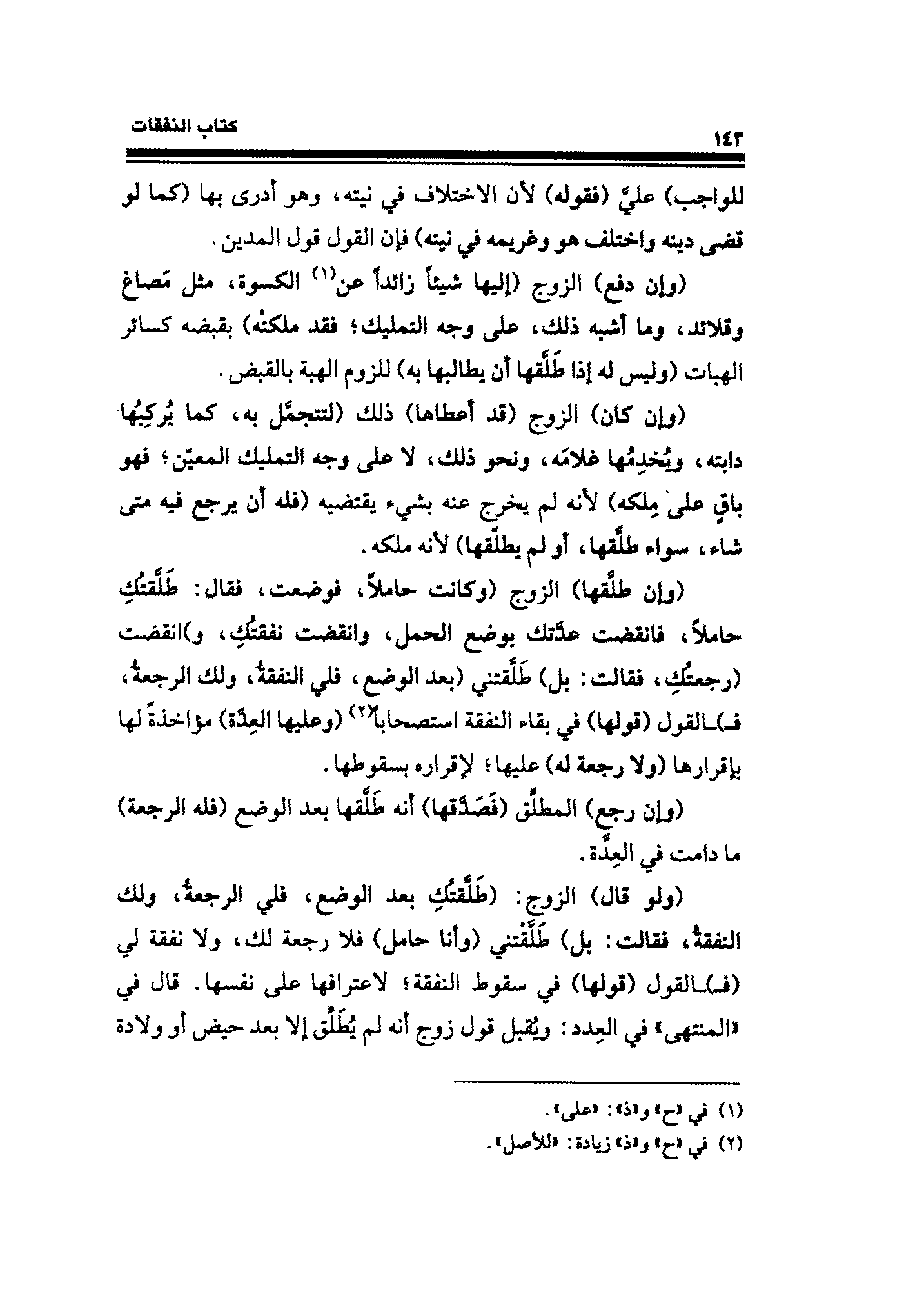 (ولو قال) الزرج: (طَلَّقتُكِ بعد الوضع، فلي الرجعةُ، ولك النفقةُ، فقالت: بل) طَلَّقْتني (وأنا حامل) فلا رجعة لك، ولا نفقة لي فـ) ـالقول (قولها) في سقوط النفقة؛ لاعترافها على نفسها. قال في "المنتهى" في العدد: ويُقبل قول زوج أنه لم يُطَلِّق إلا بعد حيض أو ولادة
