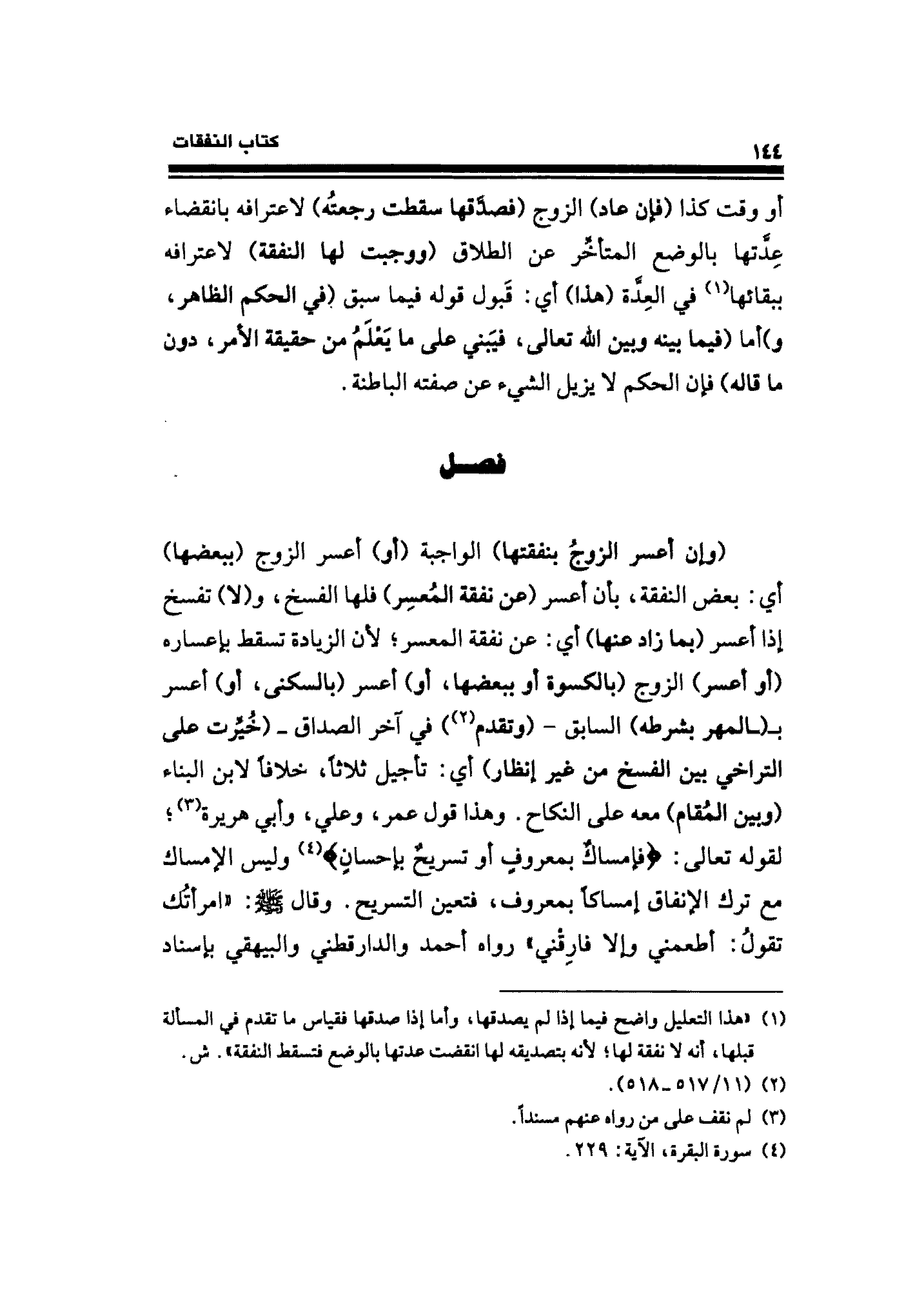 (وإن أعسر الزوجُ بنفقتها) الواجبة (أو) أعسر الزوج (ببعضها) أي: بعض النفقة، بأن أعسر (عن نفقة المُعسِر) فلها الفسخ، (لا) تفسخ إذا أعسر (بما زاد عنها) أي: عن نفقة المعسر؛ لأن الزيادة تسقط بإعساره (أو أعسر) الزوج (بالكسوة أو ببعضها، أو) أعسر (بالسكنى، أو) أعسر بـ (ـالمهر بشرطه) السابق - (وتقدم (¬٢)) في آخر الصداق- (خُيِّرت على التراخي بين الفسخ من غير إنظار) أي: تأجيل ثلاثًا، خلافًا لابن البناء (وبين المُقام) معه على النكاح. وهذا قول عمر، وعلي، وأبي هريرة (¬٣)؛ لقوله تعالى: {فَإِمْسَاكٌ بِمَعْرُوفٍ أَوْ تَسْرِيحٌ بِإِحْسَانٍ} (¬٤) وليس الإمساك مع ترك الإنفاق إمساكًا بمعروف، فتعين التسريح. وقال - صلى الله عليه وسلم -: "امرأتُك تقولُ: أطعمني وإلا فارِقْني" رواه أحمد والدارقطني والبيهقي بإسناد