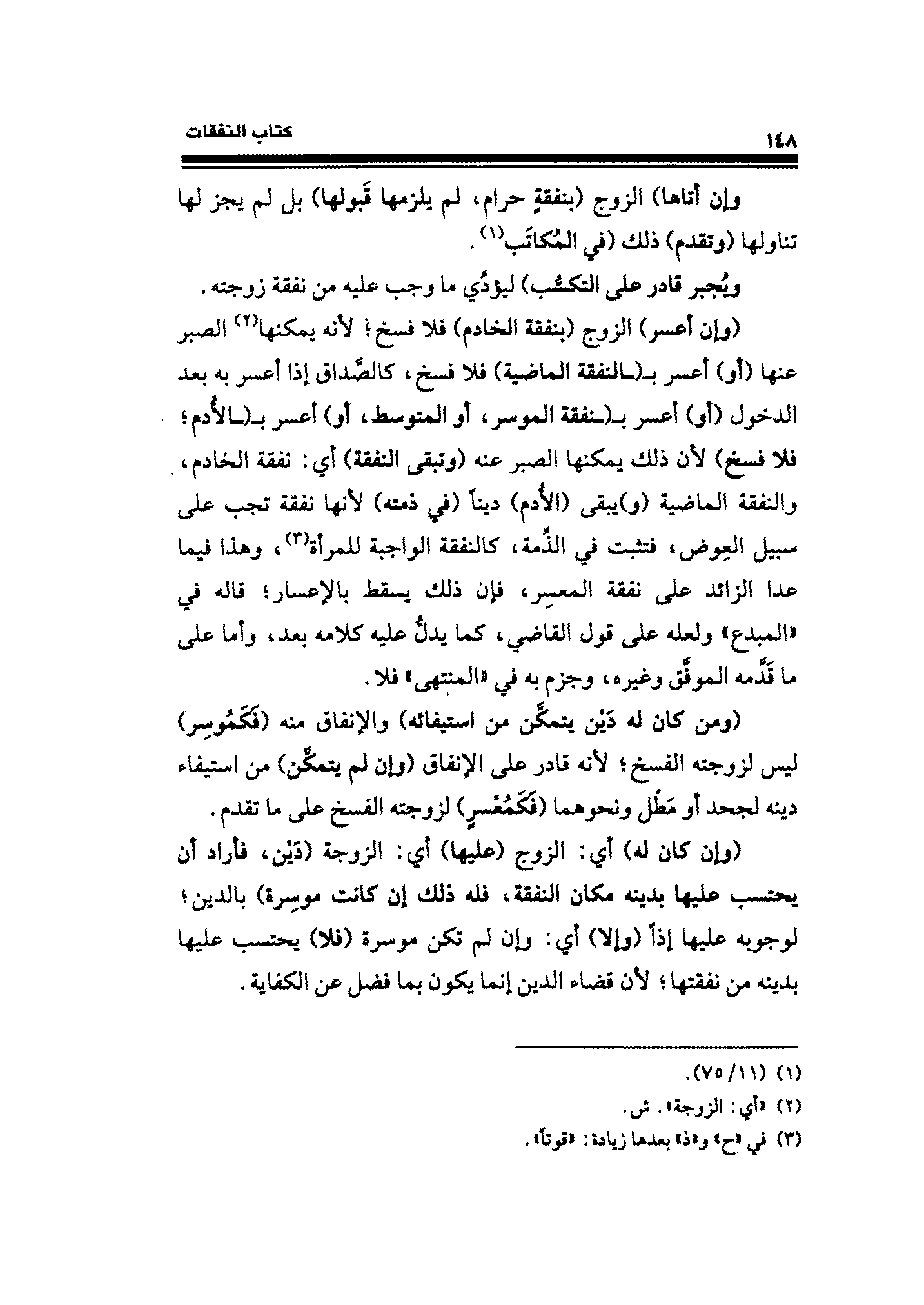 (وإن أعسر) الزوج (نفقة الخادم) فلا فسخ؛ لأنه يمكنها (¬٢) الصبر عنها (أو) أعسر بـ (ـالنفقة الماضية) فلا فسخ، كالصَّداق إذا أعسر به بعد الدخول (أو) أعسر بـ (ـالنفقة الموسر، أو المتوسط، أو) أعسر (بالأُدم؛ فلا فسخ) لأن ذلك يمكنها الصبر عنه (وتبقى النفقة) أي: نفقة الخادم، والنفقة الماضية (و) يبقى (الأُدم) دينًا (في ذمته) لأنها نفقة تجب على سبيل العِوض، فتثبت في الذِّمة، كالنفقة الواجبة للمرأة (¬٣)، وهذا فيما عدا الزائد على نفقة المعسِر، فإن ذلك يسقط بالإعسار؛ قاله في "المبدع" ولعله على قول القاضي، كما يدلُّ عليه كلامه بعد، وأما على ما قَدَّمه الموفَّق وغيره، وجزم به في "المنتهى" فلا.