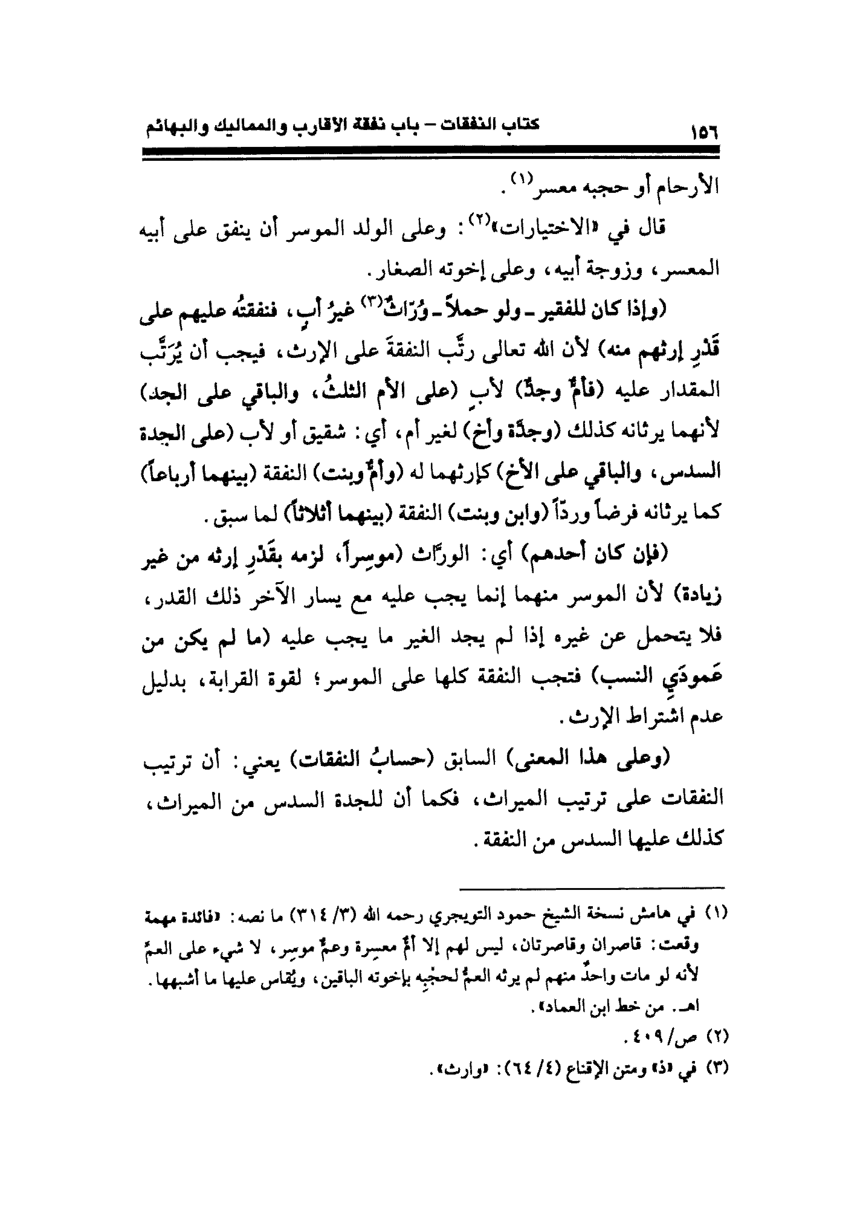 (¬١) في هامش نسخة الشيخ حمود التويجري رحمه الله (٣/ ٣١٤) ما نصه: "فائدة مهمة وقعت: قاصران وقاصرتان، ليس لهم إلا أمٌّ معسِرة وعمٌّ موسِر، لا شيء على العمِّ لأنه لو مات واحدٌ منهم لم يرثه العمُّ لحجْبِه بإخوته الباقين، ويُقاس عليها ما أشبهها. ا هـ. من خط ابن العماد".