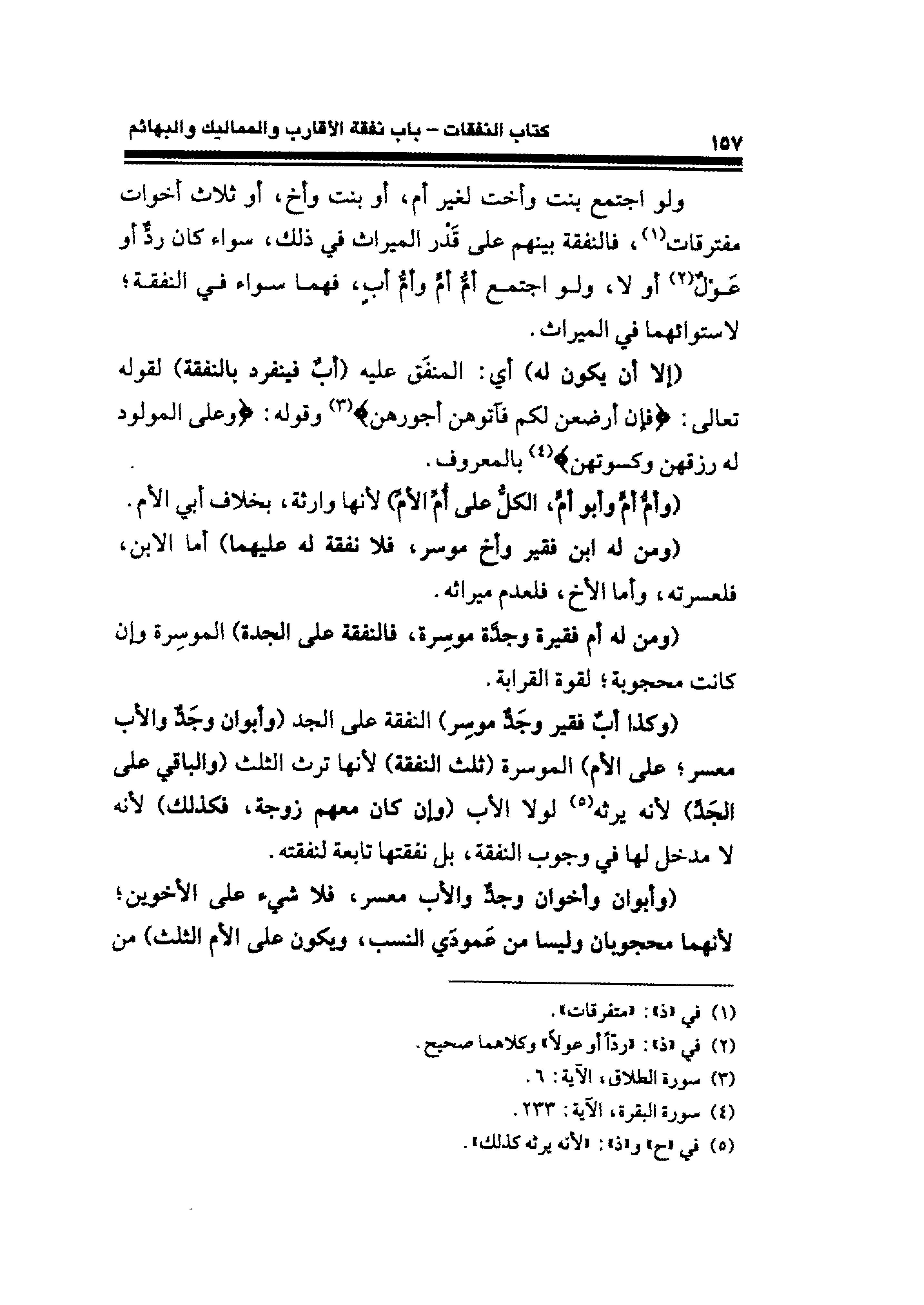 ولو اجتمع بنت وأخت لغير أم، أو بنت وأخ، أو ثلاث أخوات مفترقات (¬١)، فالنفقة بينهم على قَدْر الميراث، في ذلك، سواء كان ردٌّ أو عَوْلٌ (¬٢) أو لا، ولو اجتمع أمُّ أمِّ وأمُّ أبٍ، فهما سواء في النفقة؛ لاستوائهما في الميراث.