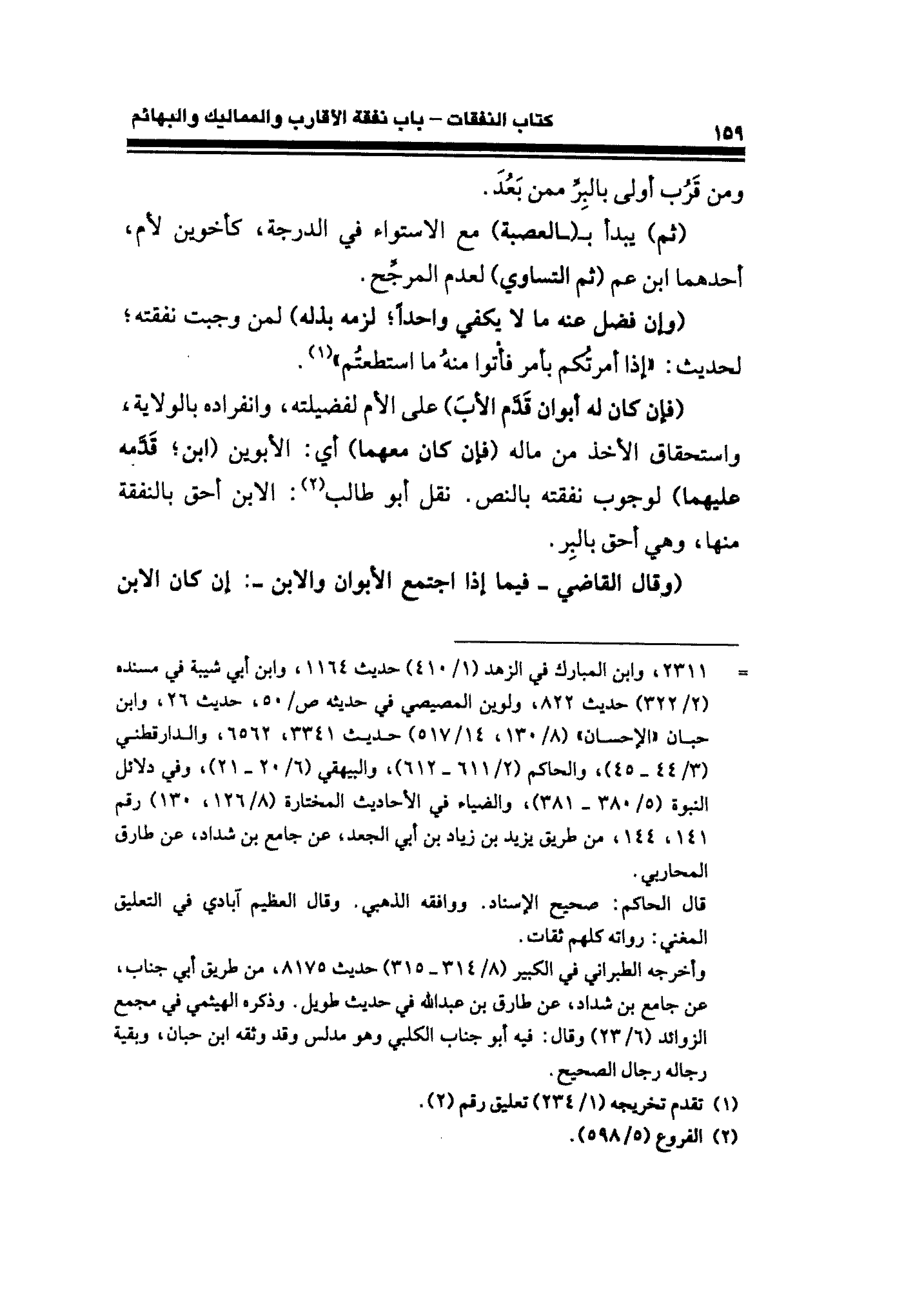 (فإن كان له أبوان قَدَّم الأبَ) على الأم لفضيلته، وانفراده بالولاية، واستحقاق الأخذ من ماله (فإن كان معهما) أي: الأبوين (ابن؛ قَدَّمه عليهما) لوجوب نفقته بالنص. نقل أبو طالب (¬٢): الابن أحق بالنفقة منها، وهي أحق بالبِر.