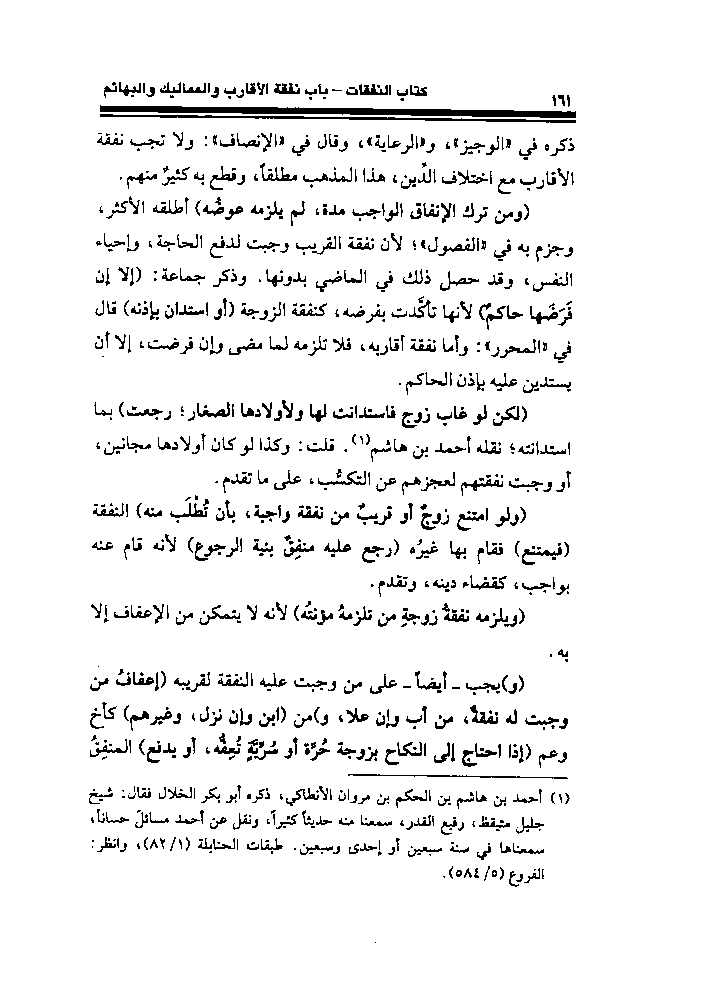 (ومن ترك الإنفاق الواجب مدة، لم يلزمه عوضُه) أطلقه الأكثر، وجزم به في "الفصول"؛ لأنَّ نفقة القريب وجبت لدفع الحاجة، وإحياء النفس، وقد حصل ذلك في الماضي بدونها. وذكر جماعة: (إلا إن فَرَضَها حاكمٌ) لأنها تأكَّدت بفرضه، كنفقة الزوجة (أو استدان بإذنه) قال في "المحرر": وأما نفقة أقاربه، فلا تلزمه لما مضى وإن فرضت، إلا أن يستدين عليه بإذن الحاكم.