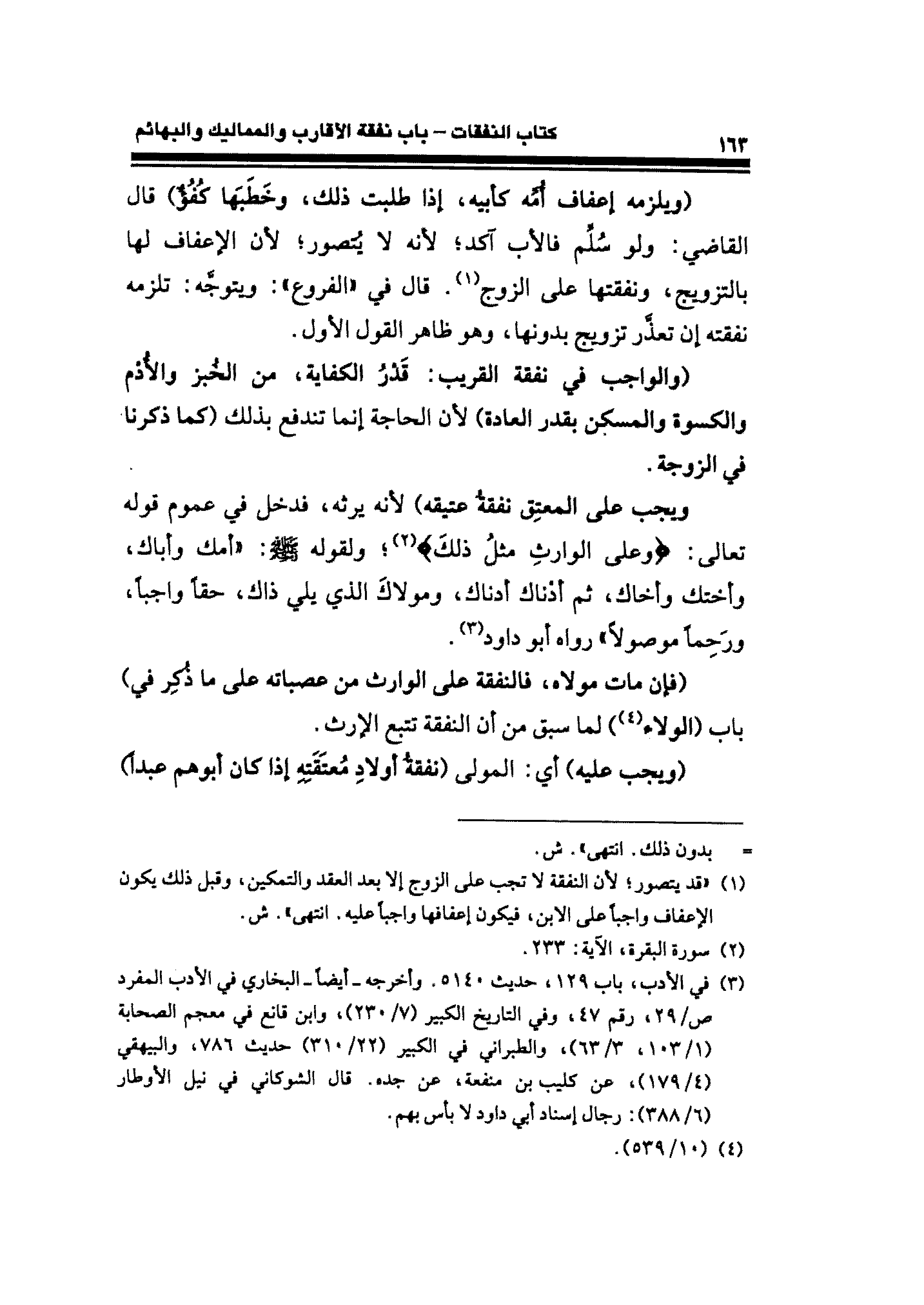 ويجب على المعتِق نفقةُ عتيقه) لأنه يرثه، فدخل في عموم قوله تعالى: {وَعَلَى الْوَارِثِ مِثْلُ ذَلِكَ} (¬٢)؛ ولقوله - صلى الله عليه وسلم -: "أمك وأباك، وأختك وأخاك، ثمَّ أدْناك أدناك، ومولاكَ الذي يلي ذاك، حقًّا واجبًا، ورَحِمًا موصولًا" رواه أبو داود (¬٣).