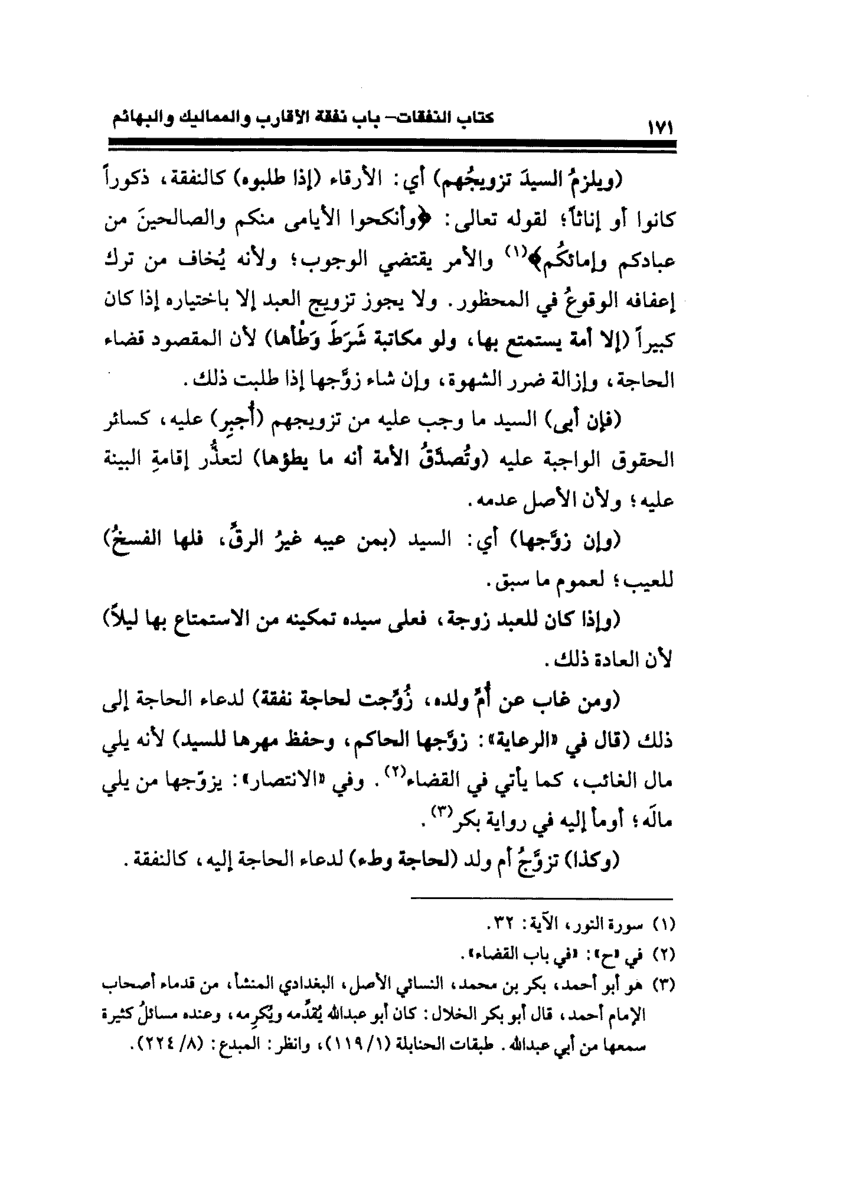 (ويلزمُ السيدَ تزويجُهم) أي: الأرقاء (إذا طلبوه) كالنفقة، ذكورًا كانوا أو إناثًا؛ لقوله تعالى: {وأنكحوا الأيامى منكم والصالحينَ من عبادكم وإمائكُم} (¬١) والأمر يقتضي الوجوب؛ ولأنه يُخاف من ترك إعفافه الوقوعُ في المحظور. ولا يجوز تزويج العبد إلا باختياره إذا كان كبيرًا (إلا أمة يستمتع بها، ولو مكاتبة شَرَطَ وَطْأها) لأن المقصود قضاء الحاجة، وإزالة ضرر الشهوة، وإن شاء زوَّجها إذا طلبت ذلك.