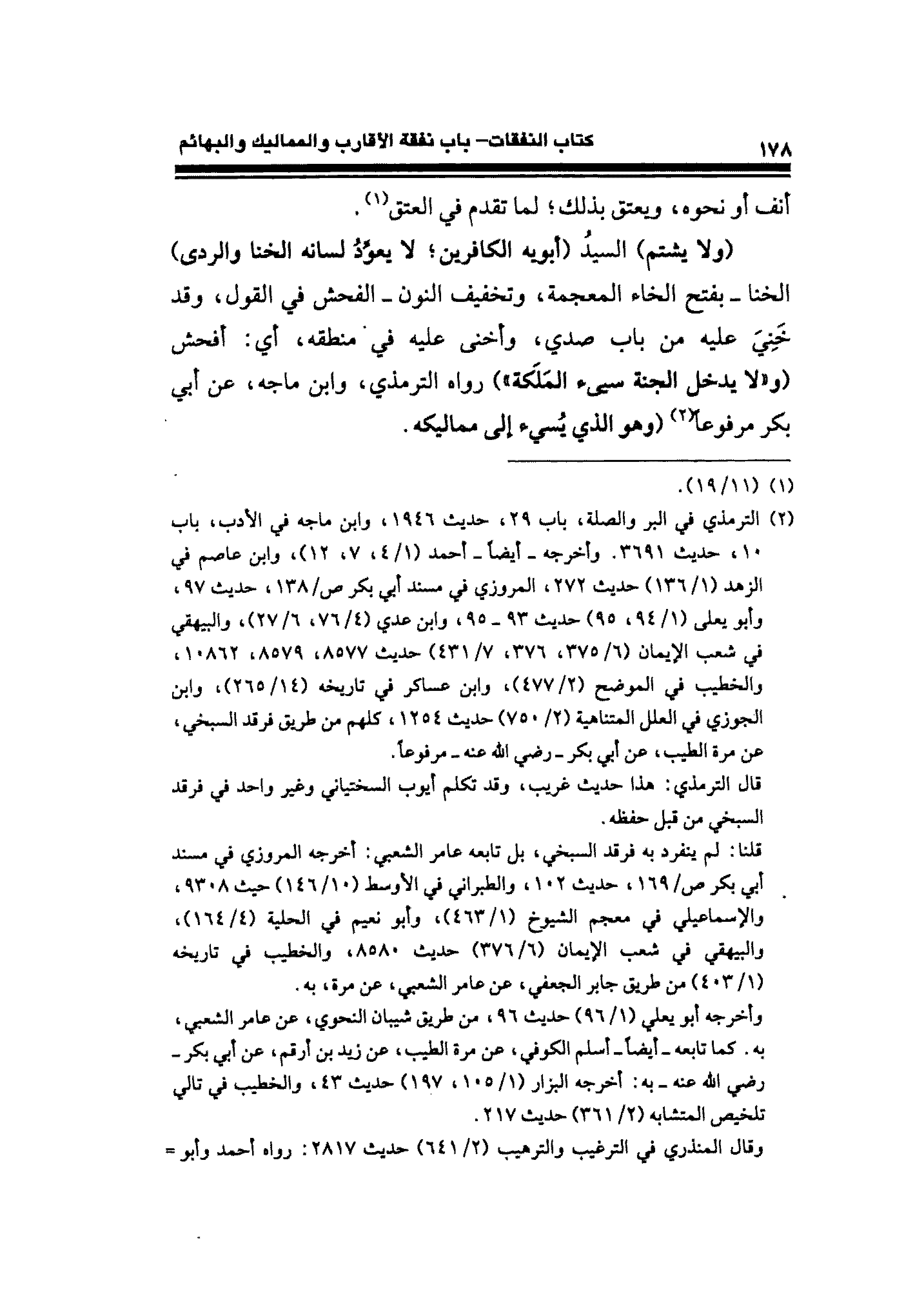 (ولا يشتم) السيدُ (أبويه الكافرين؛ لا يعوِّدُ لسانه الخنا والردى) الخنا -بفتح الخاء المعجمة، وتخفيف النون- الفحش في القول، وقد خَنِيَ عليه من باب صدي، وأخنى عليه في منطقه، أي: أفحش (و"لا يدخل الجنة سيئ المَلَكة") رواه الترمذي، وابن ماجه، عن أبي بكر مرفوعًا (¬٢) (وهو الذي يُسيء إلى مماليكه.