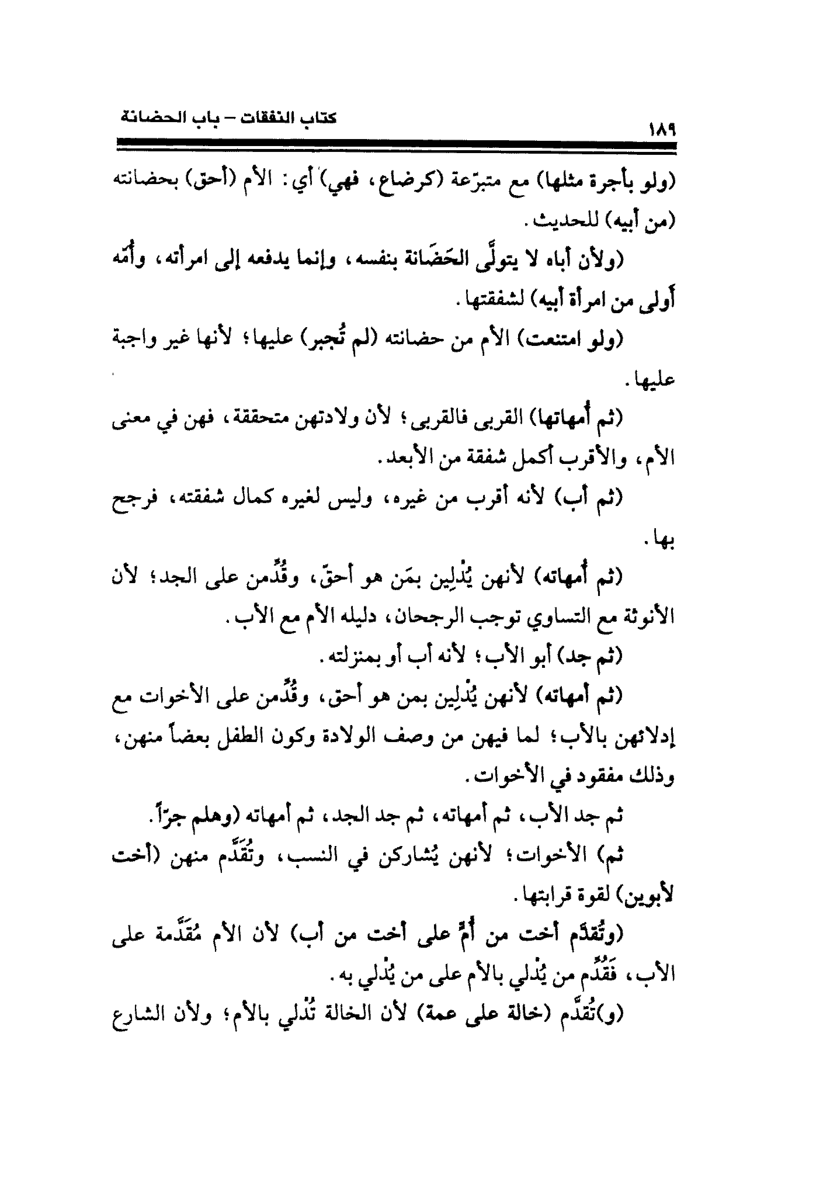 (ثم أمهاته) لأنهن يُدْلِين بمن هو أحق، وقُدِّمن على الأخوات مع إدلائهن بالأب؛ لما فيهن من وصف الولادة وكون الطفل بعضًا منهن، وذلك مفقود في الأخوات.
