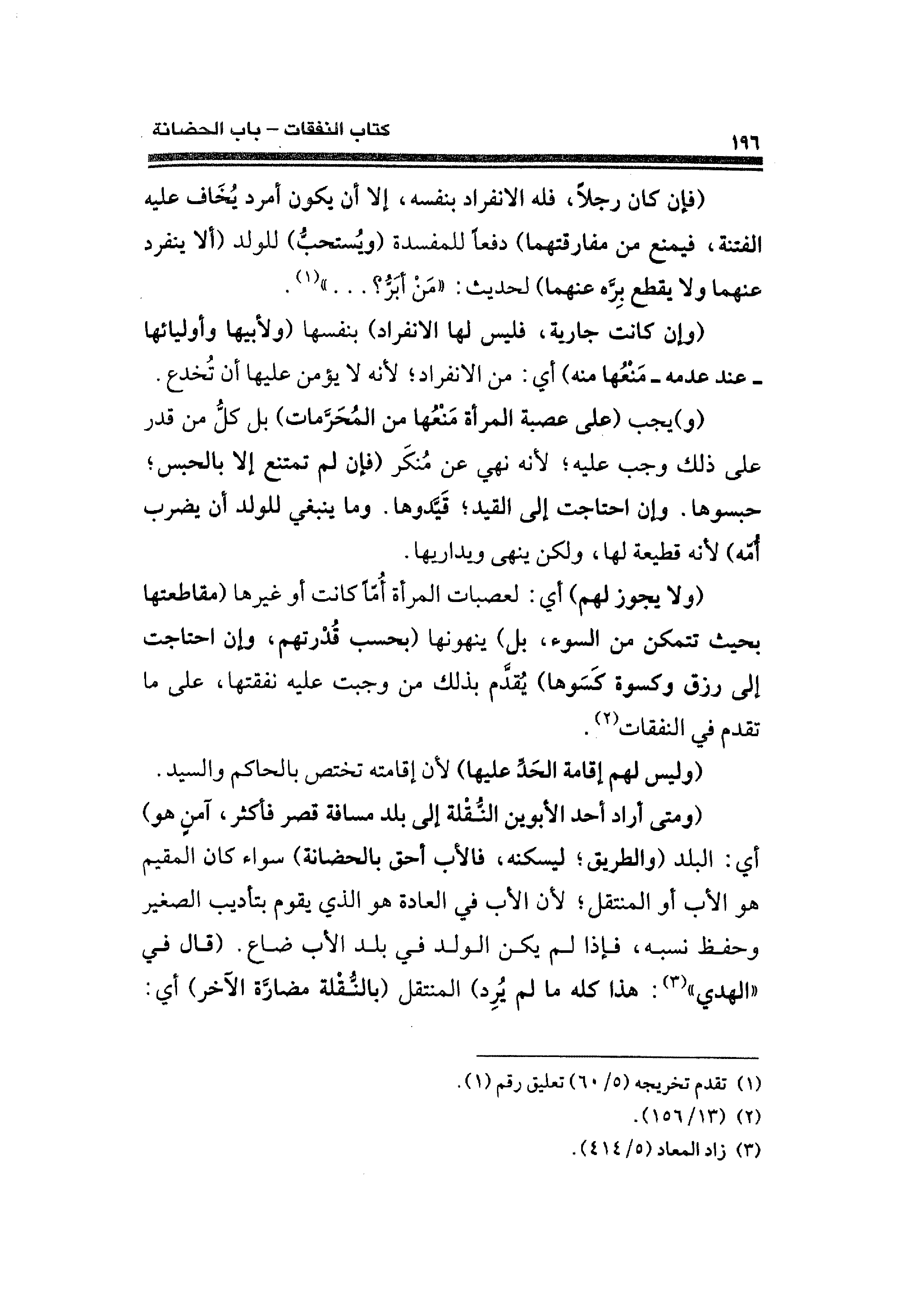 (ومتى أراد أحد الأبوين النُّقْلة إلى بلد مسافة قصر فأكثر، آمنٍ هو) أي: البلد (والطريق؛ ليسكنه، فالأب أحق بالحضانة) سواء كان المقيم هو الأب أو المنتقل؛ لأن الأب في العادة هو الذي يقوم بتأديب الصغير وحفظ نسبه، فإذا لم يكن الولد في بلد الأب ضاع. (قال في "الهدي" (¬٣): هذا كله ما لم يُرِد) المنتقل (بالنُّقلة مضارَّة الآخر) أي: