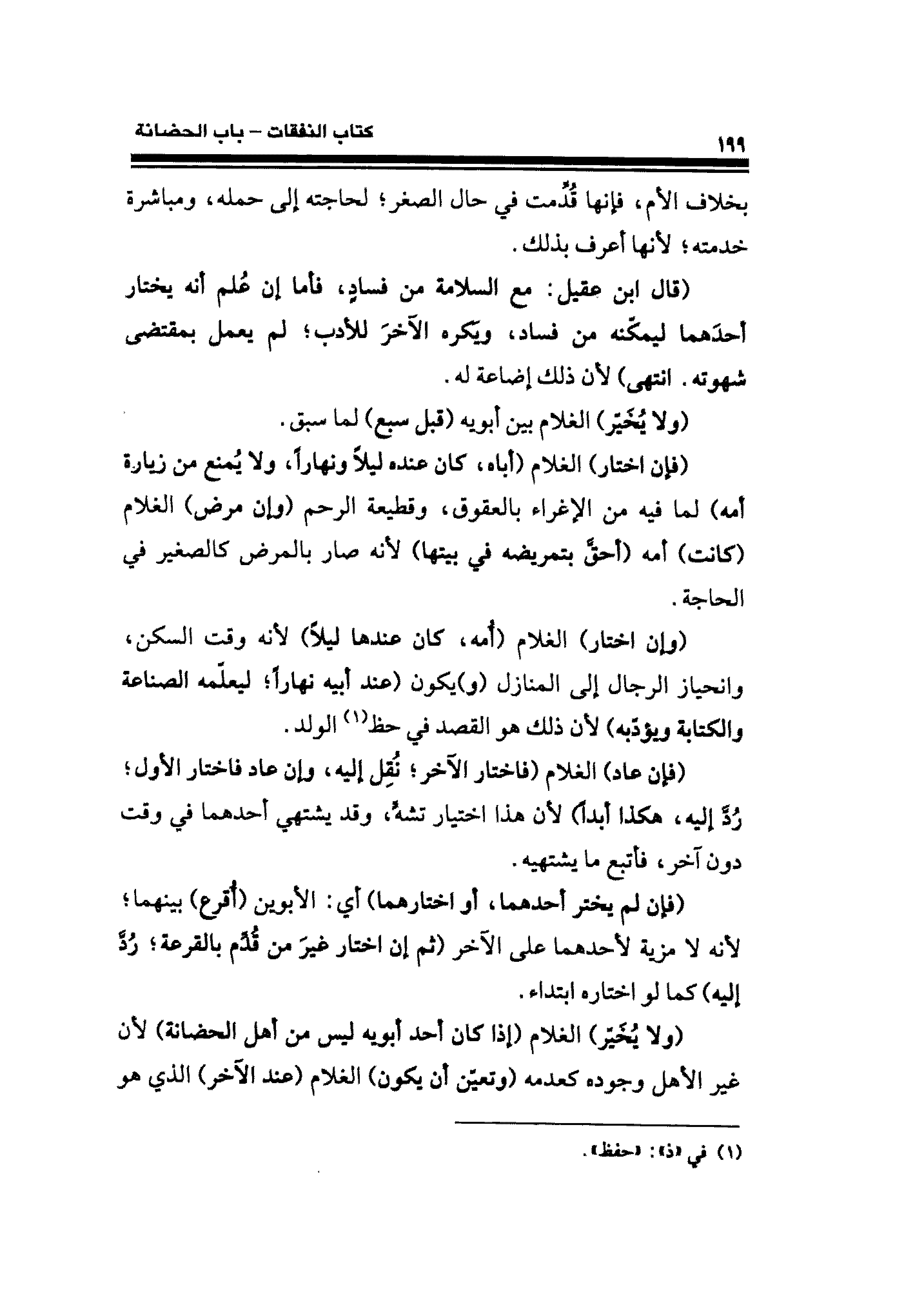 (فإن اختار) الغلام (أباه، كان عنده ليلًا ونهارًا، ولا يُمنع من زيارة أمه) لما فيه من الإغراء بالعقوق، وقطيعة الرحم (وإن مرض) الغلام (كانت) أمه (أحقَّ بتمريضه في بيتها) لأنه صار بالمرض كالصغير في الحاجة.
