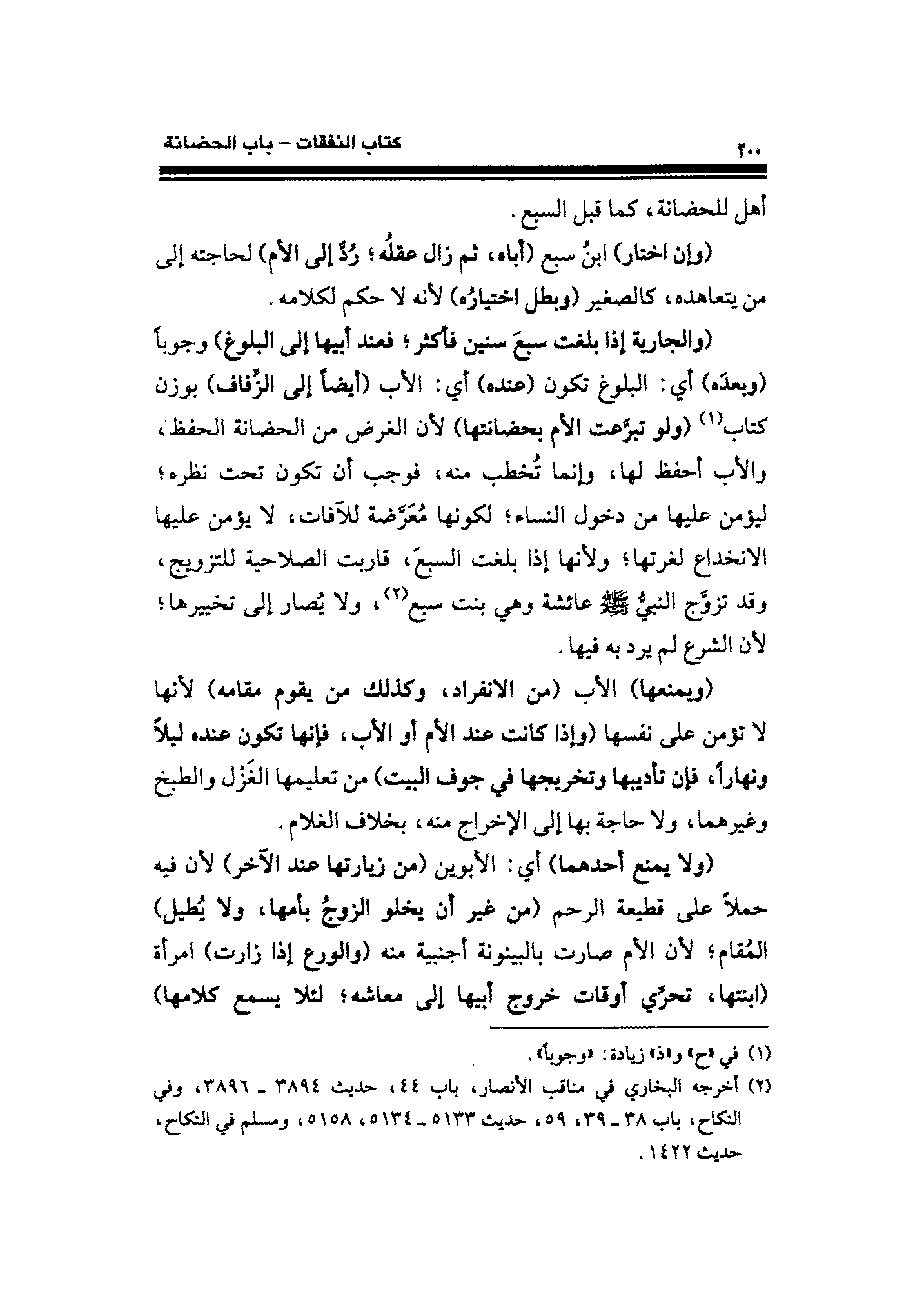 (والجارية إذا بلغت سبعَ سنين فأكثر؛ فعند أبيها إلى البلوغ) وجوبًا (وبعدَه) أي: البلوغ تكون (عنده) أي: الأب (أيضًا إلى الزِّفاف) بوزن كتاب (¬١) (ولو تبرَّعت الأم بحضانتها) لأن الغرض من الحضانة الحفظ، والأب أحفظ لها، وإنما تُخطب منه، فوجب أن تكون تحت نظره؛ ليؤمن عليها من دخول النساء؛ لكونها مُعَرَّضة للآفات، لا يؤمن عليها الانخداع لغرتها؛ ولأنها إذا بلغت السبعَ، قاربت الصلاحية للتزويج، وقد تزوَّج النبيُّ - صلى الله عليه وسلم - عائشة وهي بنت سبع (¬٢)، ولا يُصار إلى تخييرها؛ لأن الشرع لم يرد به فيها.