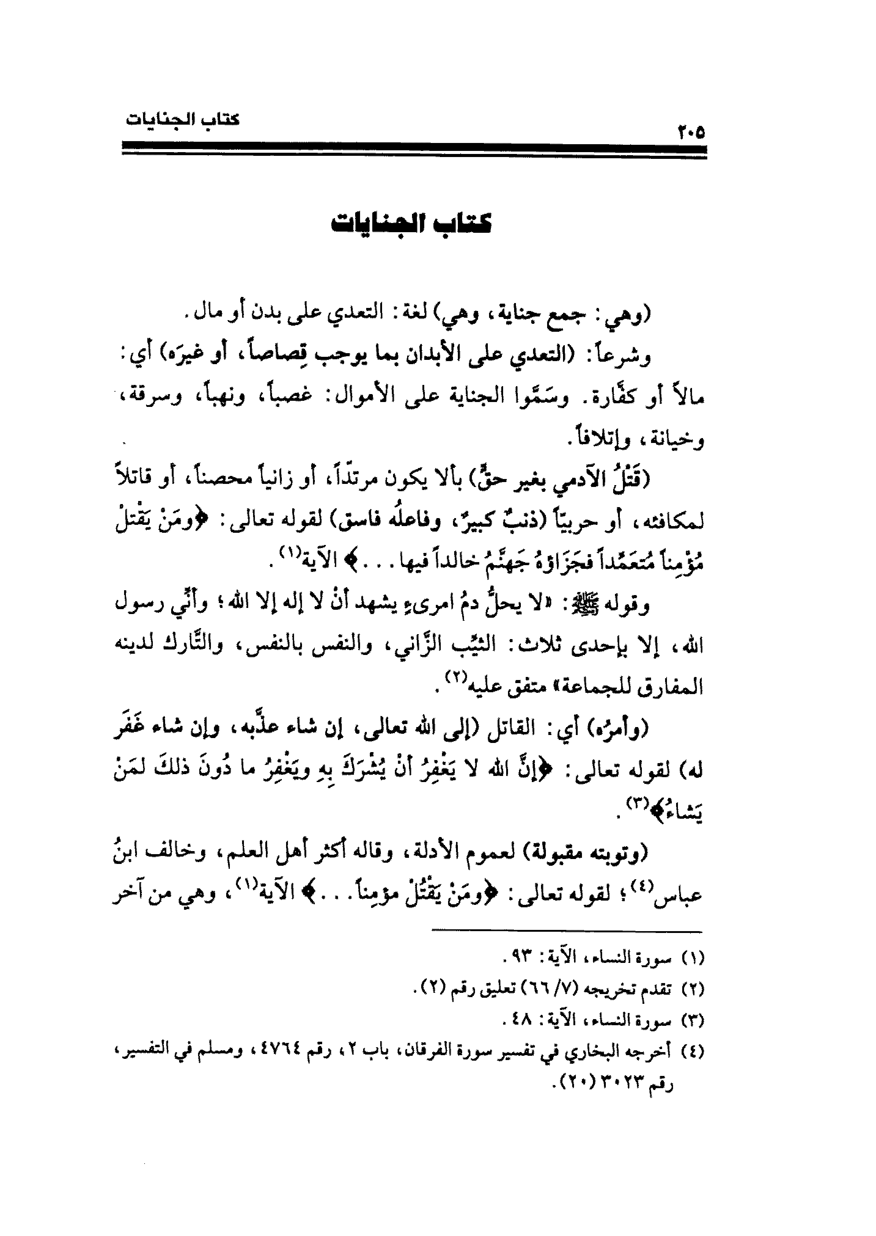 وقوله - صلى الله عليه وسلم -: "لا يحل دمُ امرئٍ يشهد أنْ لا إله إلا الله؛ وأنِّي رسول الله، إلا بإحدى ثلاث: الثيِّب الزَّاني، والنفس بالنفس، والتَّارك لدينه المفارق للجماعة" متفق عليه (¬٢).