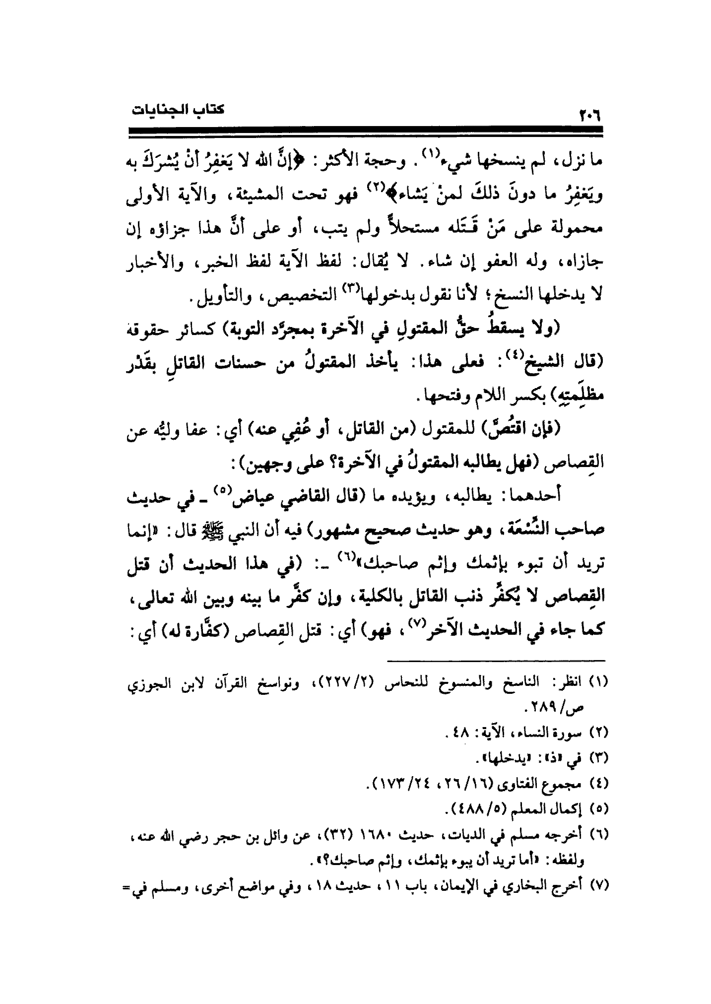 (¬٦) أخرجه مسلم في الديات، حديث ١٦٨٠ (٣٢)، عن وائل بن حجر رضي الله عنه، ولفظه: "أما تريد أن يبوء بإثمك، وإثم صاحبك؟ ".