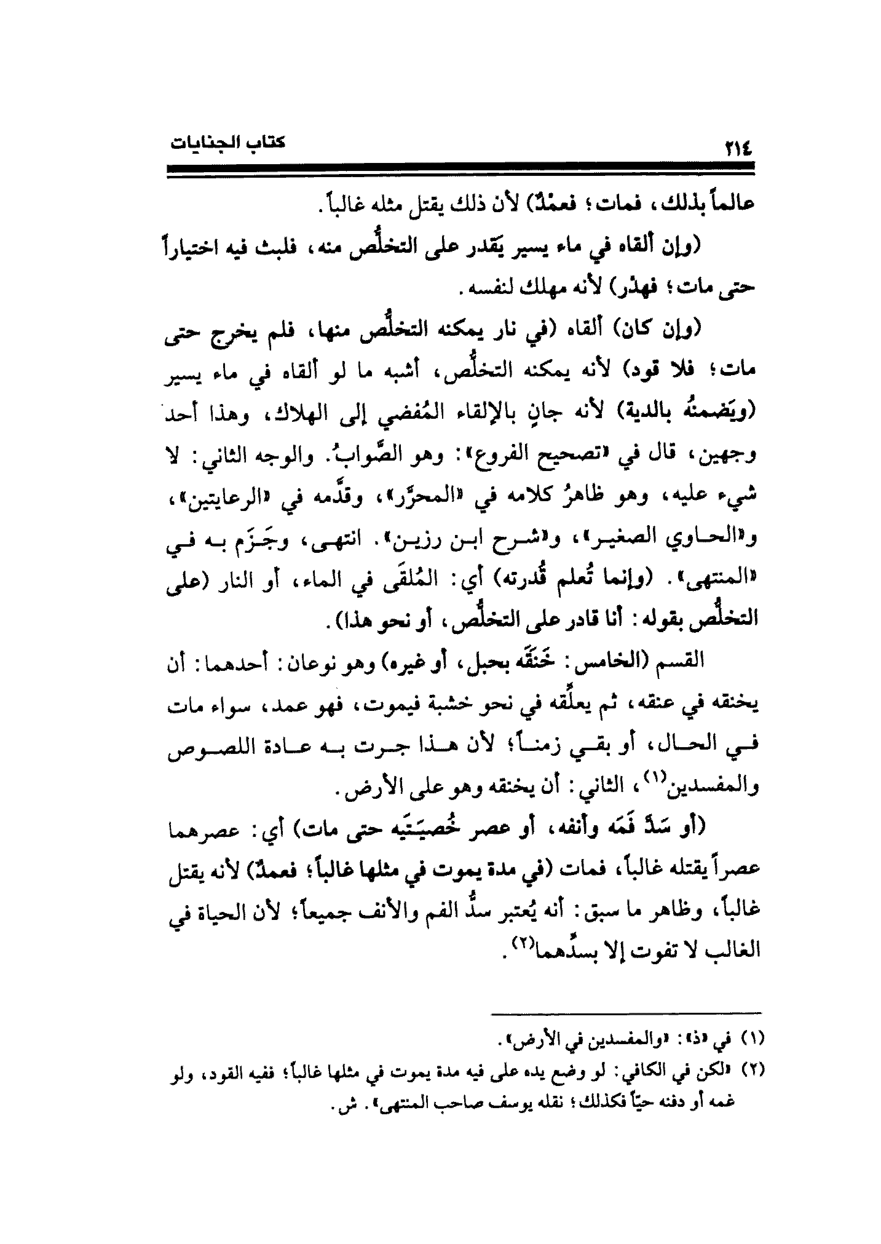 (¬٢) "لكن في الكافي: لو وضع يده على فيه مدة يموت في مثلها غالبًا؛ فيه القود، ولو غمه أو دفنه حيًّا فكذلك؛ نقله يوسف صاحب المنتهى". ش.