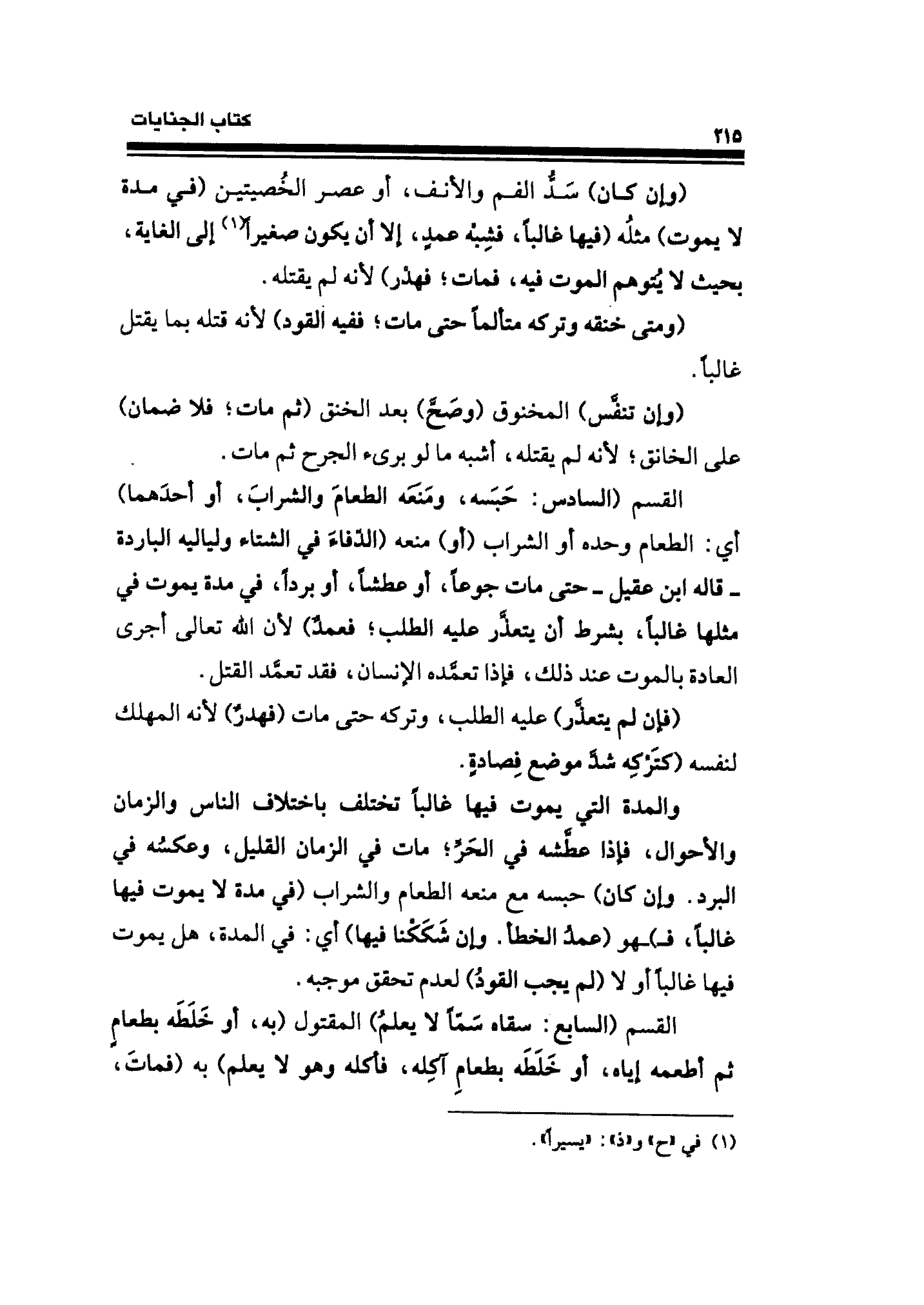 القسم (السادس: حَبَسه، ومَنَعَه الطعام والشرابَ، أو أحدَهما) أي: الطعام وحده أو الشراب (أو) منعه (الدّفاءَ في الشتاء ولياليه الباردة -قاله ابن عقيل- حتى مات جوعًا، أو عطشًا، أو بردًا، في مدة يموت في مثلها غالبًا، بشرط أن يتعذَّر عليه الطلب؛ فعمدٌ) لأن الله تعالى أجرى العادة بالموت عند ذلك، فإذا تعمَّده الإنسان، فقد تعمَّد القتل.