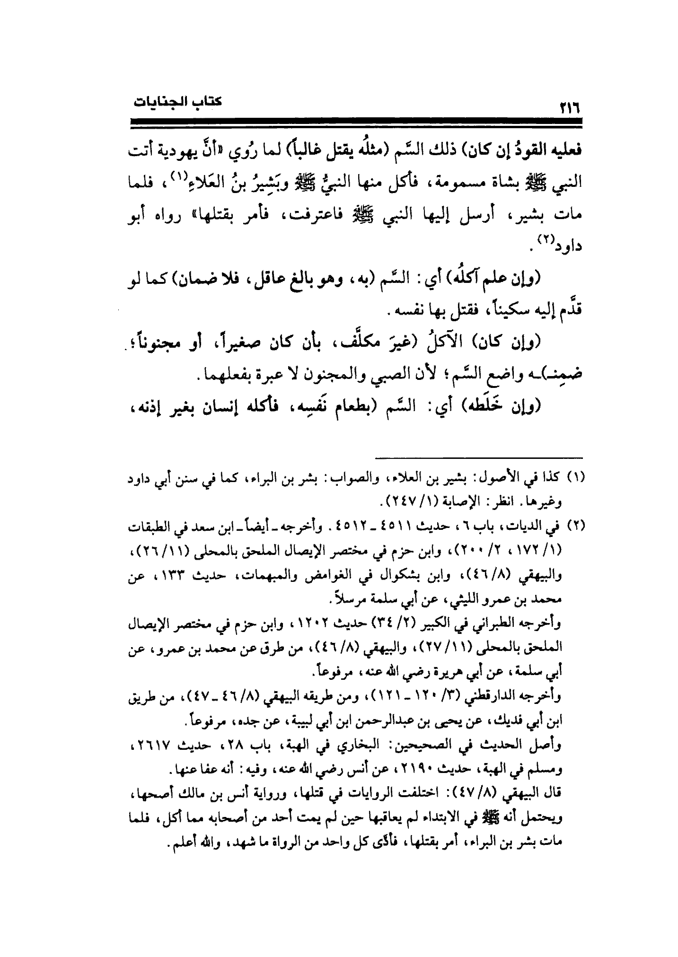 فعليه القودُ إن كان) ذلك السَّم (مثلُه يقتل غالبًا) لما رُوي "أنَّ يهودية أتت النبي - صلى الله عليه وسلم - بشاة مسمومة، فأكل منها النبي - صلى الله عليه وسلم - وبَشِيرُ بن العَلاءِ (¬١)، فلما مات بشير، أرسل إليها النبي - صلى الله عليه وسلم - فاعترفت، فأمر بقتلها" رواه أبو داود (¬٢).