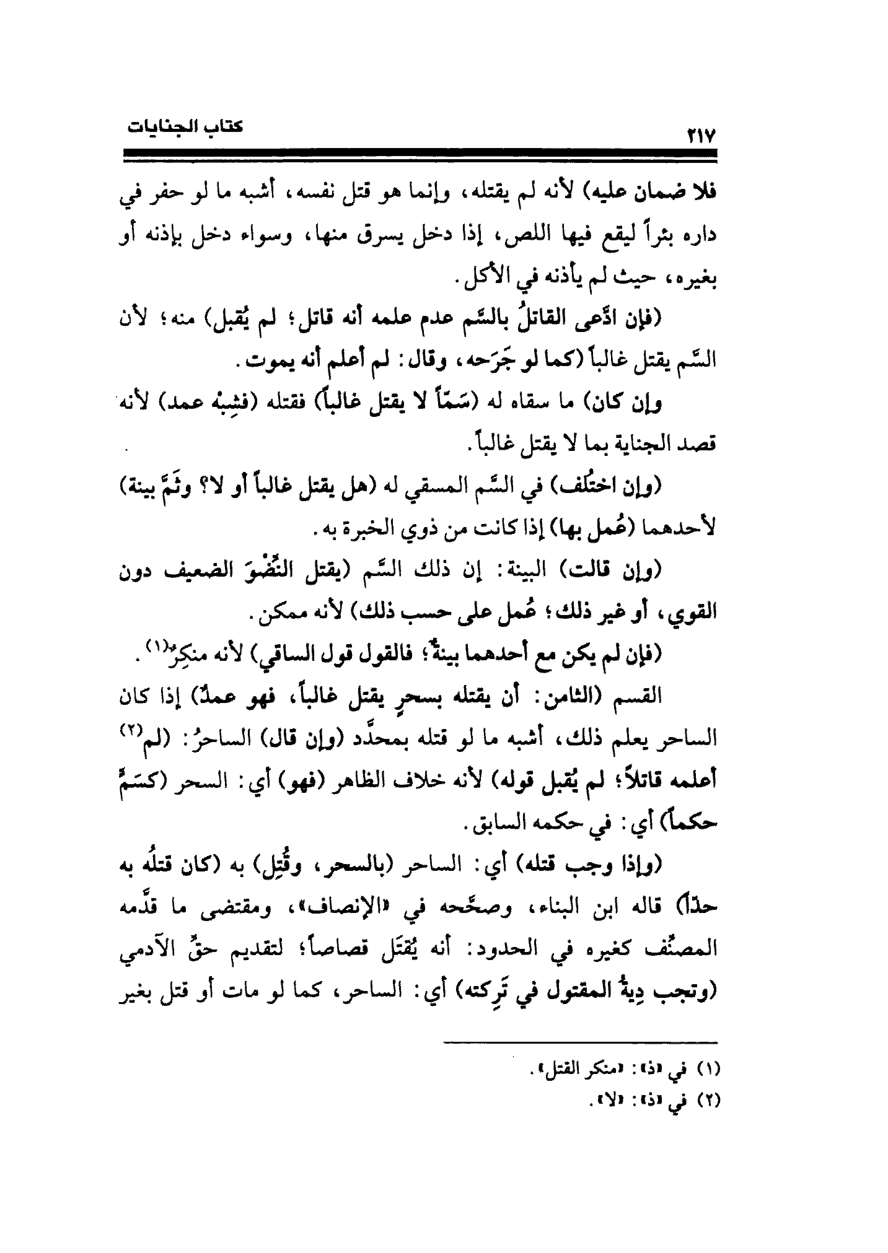 القسم (الثامن: أن يقتله بسحرٍ يقتل غالبًا، فهو عمدٌ) إذا كان الساحر يعلم ذلك، أشبه ما لو قتله بمحدَّد (وإن قال) الساحرُ: (لم (¬٢) أعلمه قاتلًا؛ لم يُقبل قوله) لأنه خلاف الظاهر (فهو) أي: السحر (كسَمٍّ حكمًا) أي: في حكمه السابق.