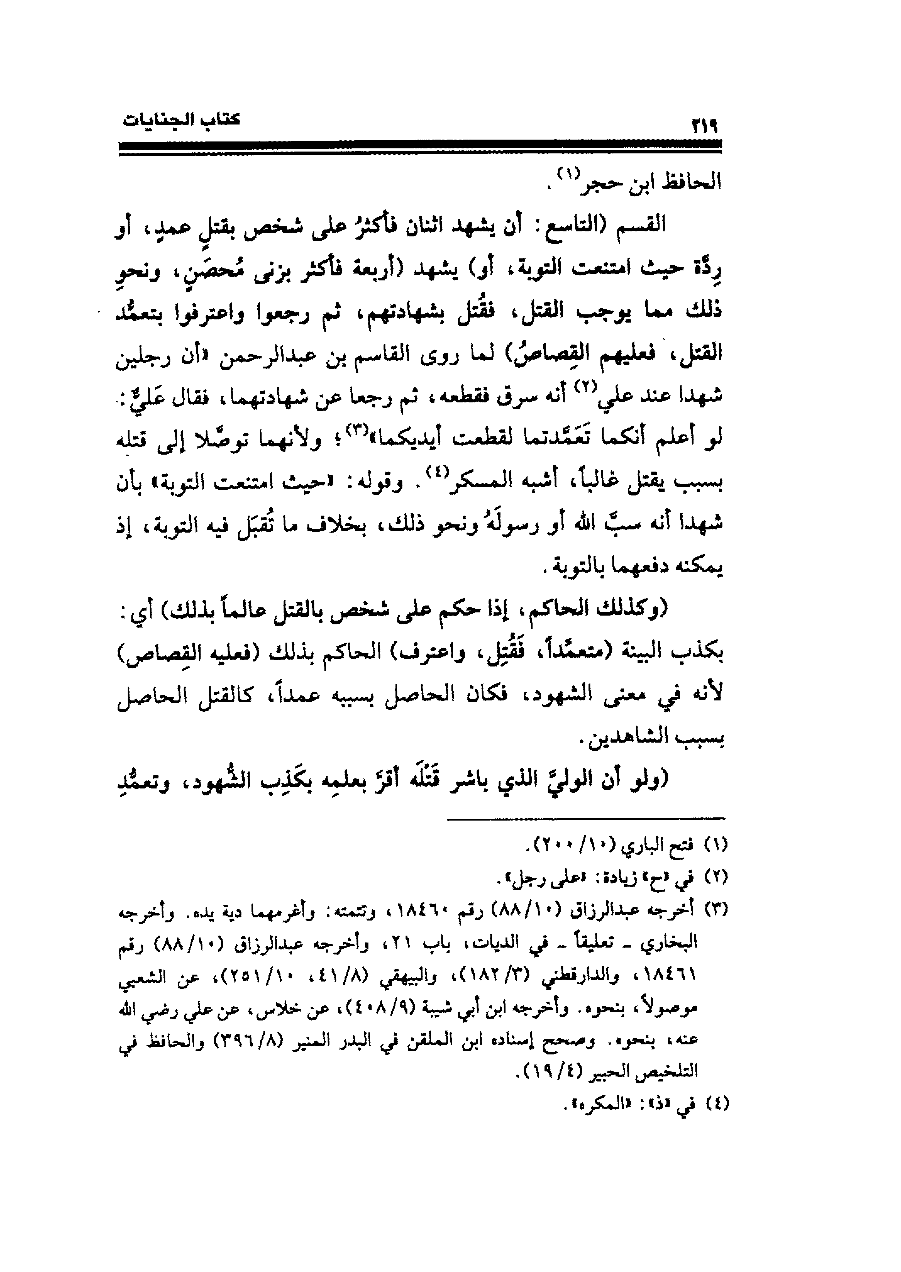 القسم (التاسع: أن يشهد اثنان فأكثرُ على شخص بقتلٍ عمدٍ، أو رِدَّة حيث امتنعت التوبة، أو) يشهد (أربعة فأكثر بزنى مُحصَنٍ، ونحو ذلك مما يوجب القتل، فقُتل بشهادتهم، ثم رجعوا واعترفوا بتعمُّد القتل، فعليهم القِصاصُ) لما روى القاسم بن عبد الرحمن "أن رجلين شهدا عند علي (¬٢) أنه سرق فقطعه، ثم رجعا عن شهادتهما، فقال عَليٌّ: لو أعلم أنكما تَعَمَّدتما لقطعت أيديكما" (¬٣)؛ ولأنهما توصَّلا إلى قتله بسبب يقتل غالبًا، أشبه المسكر (¬٤). وقوله: "حيث امتنعت التوبة" بأن شهدا أنه سبَّ الله أو رسولَهُ ونحو ذلك، بخلاف ما تُقبَل فيه التوبة، إذ يمكنه دفعهما بالتوبة.