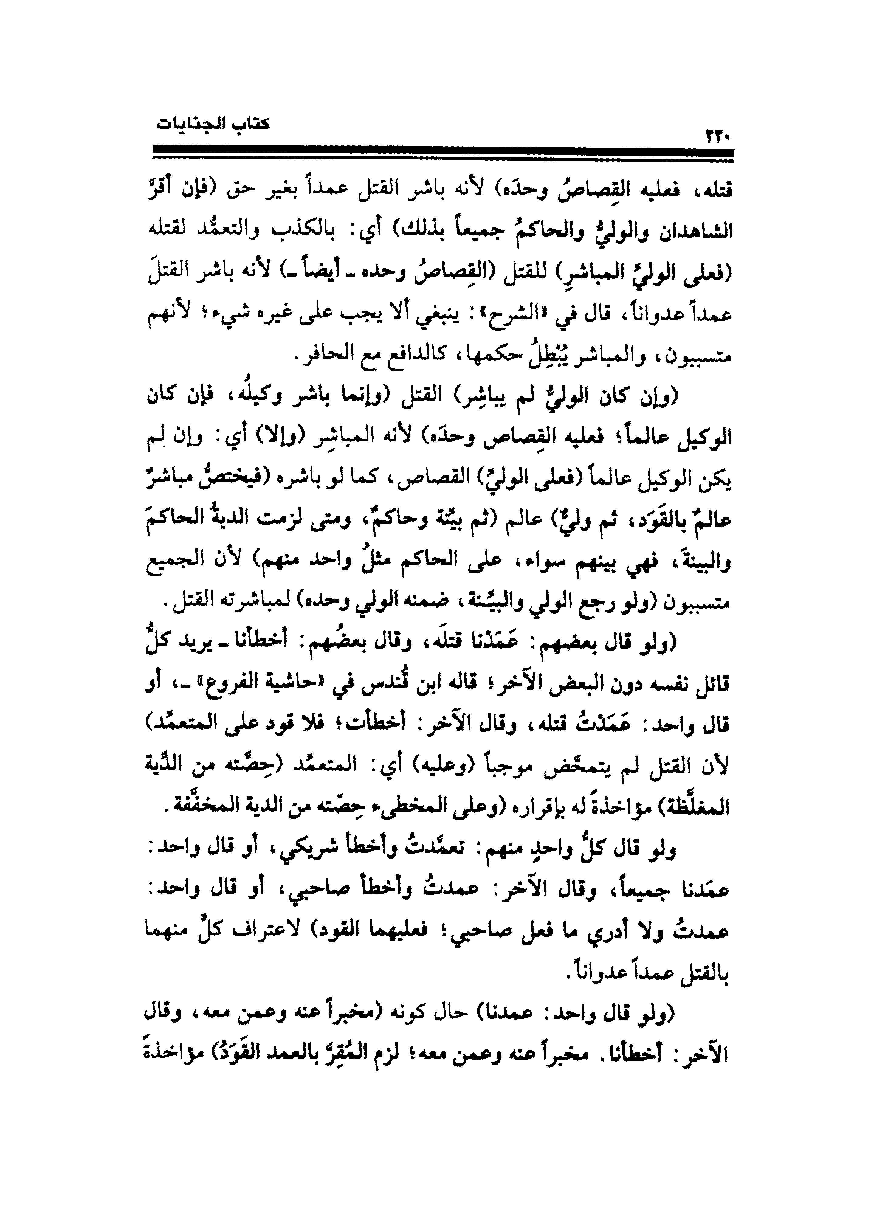 قتله، فعليه القِصاصُ وحدَه) لأنه باشر القتل عمدًا بغير حق (فإن أقرَّ الشاهدان والوليُّ والحكمُ جميعًا بذلك) أي: بالكذب والتعمُّد لقتله (فعلى الوليِّ المباشرِ) للقتل (القِصاصُ وحده -أيضًا-) لأنه باشر القتلَ عمدًا عدوانًا، قال في "الشرح": ينبغي ألا يجب على غيره شيء؛ لأنهم متسببون، والمباشر يُبْطِلُ حكمها، كالدافع مع الحافر.