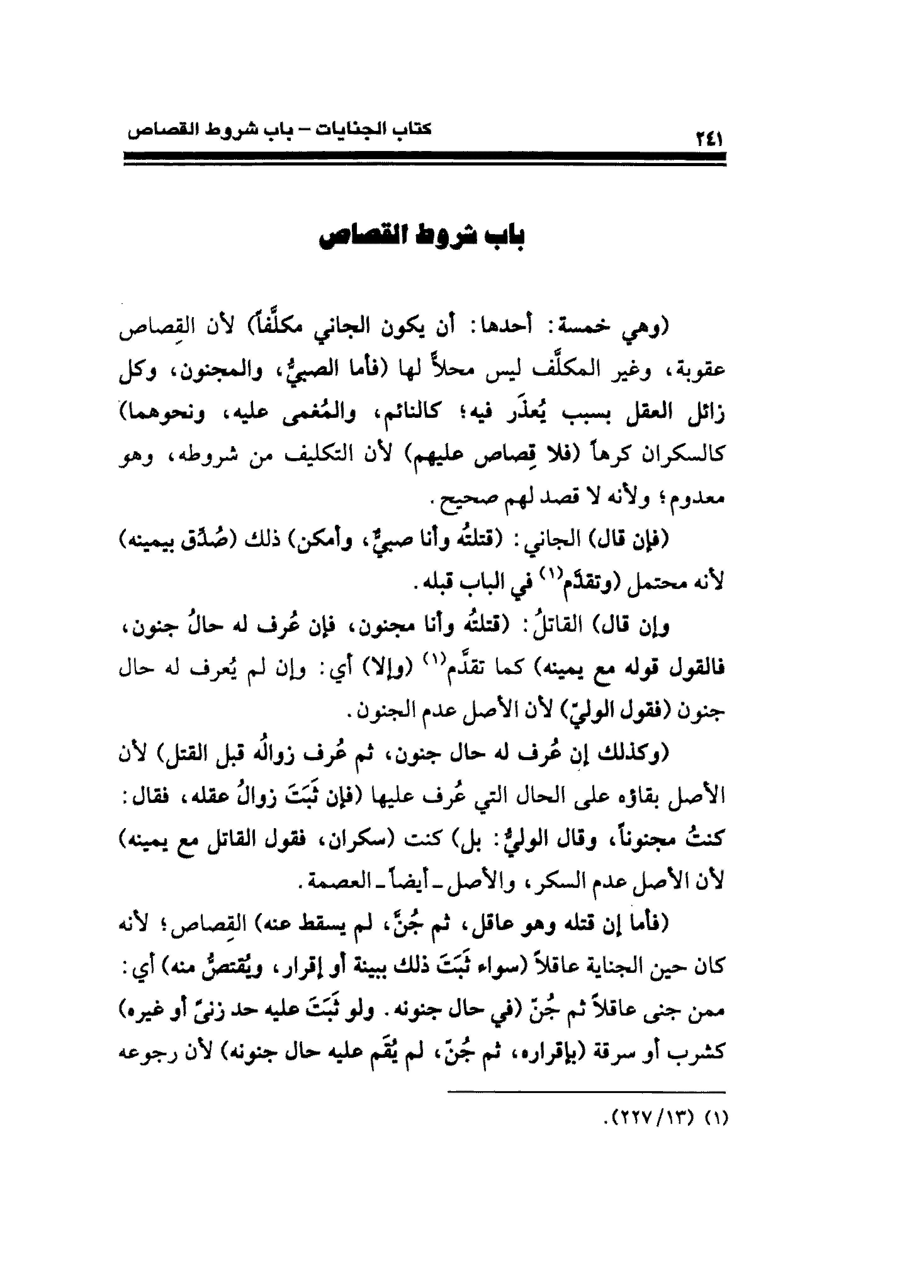 (وهي خمسة: أحدها: أن يكون الجاني مكلَّفًا) لأن القِصاص عقوبة، وغير المكلَّف ليس محلاًّ لها (فأما الصبيُّ، والمجنون، وكل زائل العقل بسبب يُعذَر فيه؛ كالنائم، والمُغمى عليه، ونحوهما) كالسكران كرهًا (فلا قصاص عليهم) لأن التكليف من شروطه، وهو معدوم؛ ولأنه لا قصد لهم صحيح.