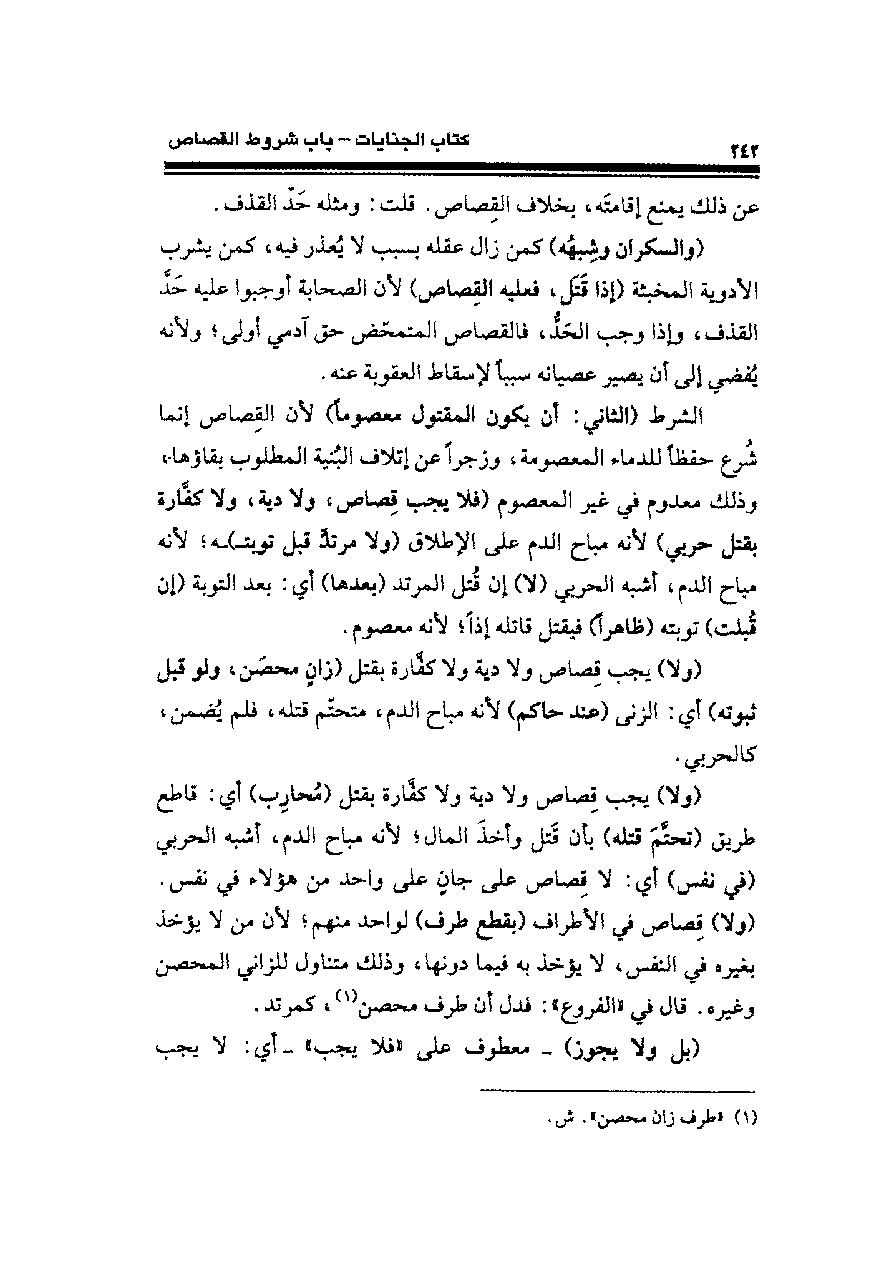 الشرط (الثاني: أن يكون المقتول معصومًا) لأن القِصاص إنما شُرع حفظًا للدماء المعصومة، وزجرًا عن إتلاف البُنية المطلوب بقاؤها، وذلك معدوم فِي غير المعصوم (فلا يجب قِصاص، ولا دية، ولا كفَّارة بقتل حربي) لأنه مباح الدم على الإطلاق (ولا مرتدٍّ قبل توبتـ) ـه؛ لأنه مباح الدم، أشبه الحربي (لا) إن قُتل المرتد (بعدها) أي: بعد التوبة (إن قُبلت) توبته (ظاهرًا) فيقتل قاتله إذًا؛ لأنه معصوم.