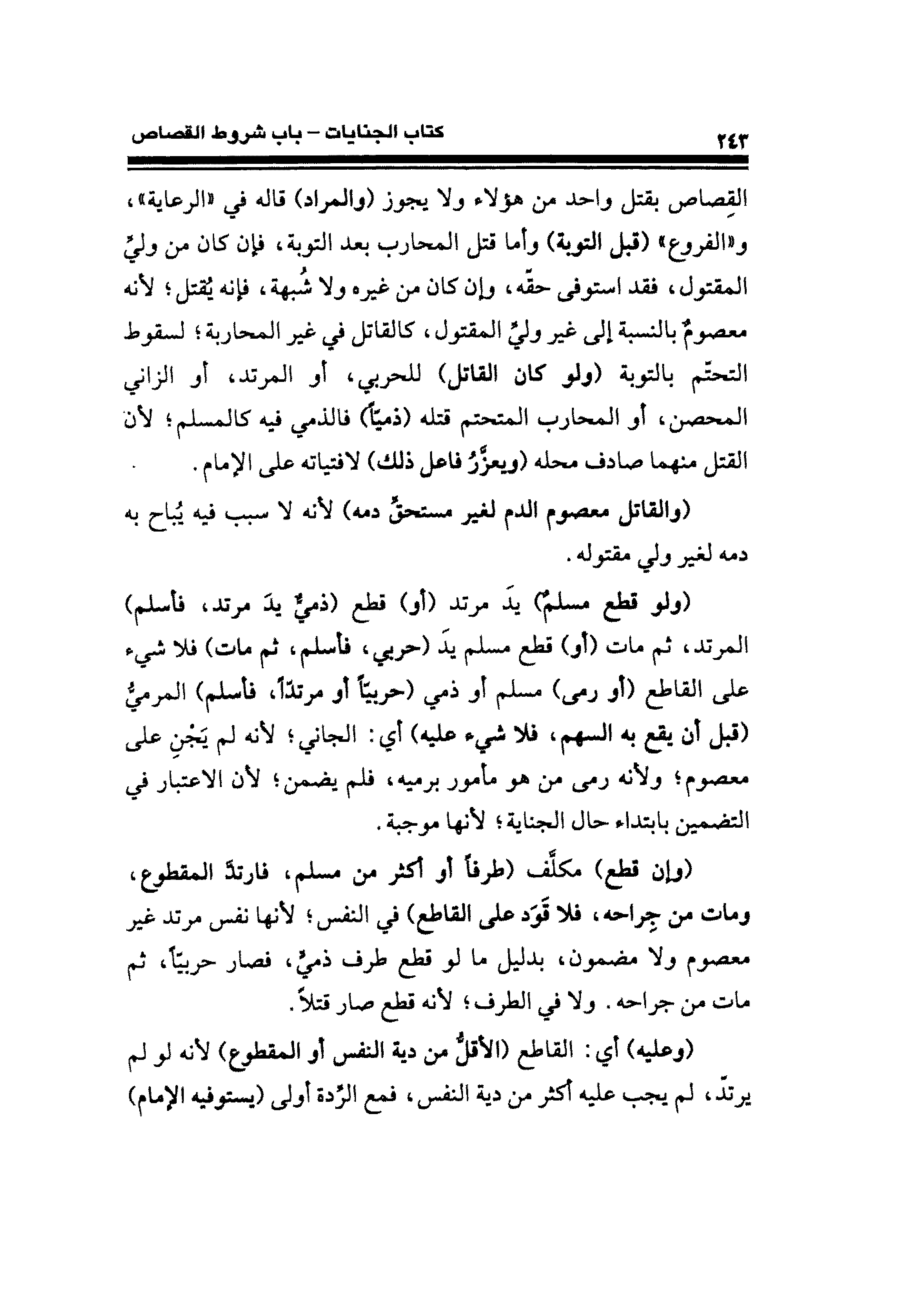 القِصاص بقتل واحد من هؤلاء ولا يجوز (والمراد) قاله فِي "الرعاية"، و"الفروع" (قبل التوبة) وأما قتل المحارب بعد التوبة، فإن كان من وليِّ المقتول، فقد استوفى حقّه، وإن كان من غيره ولا شُبهة، فإنه يُقتل؛ لأنه معصومٌ بالنسبة إِلَى غير وليِّ المقتول، كالقاتل في غير المحاربة؛ لسقوط التحتّم بالتوبة (ولو كان القاتل) للحربي، أو المرتد، أو الزاني المحصن، أو المحارب المتحتم قتله (ذميًّا) فالذمي فيه كالمسلم؛ لأن القتل منهما صادف محله (ويعزَّرُ فاعل ذلك) لافتياته على الإِمام.