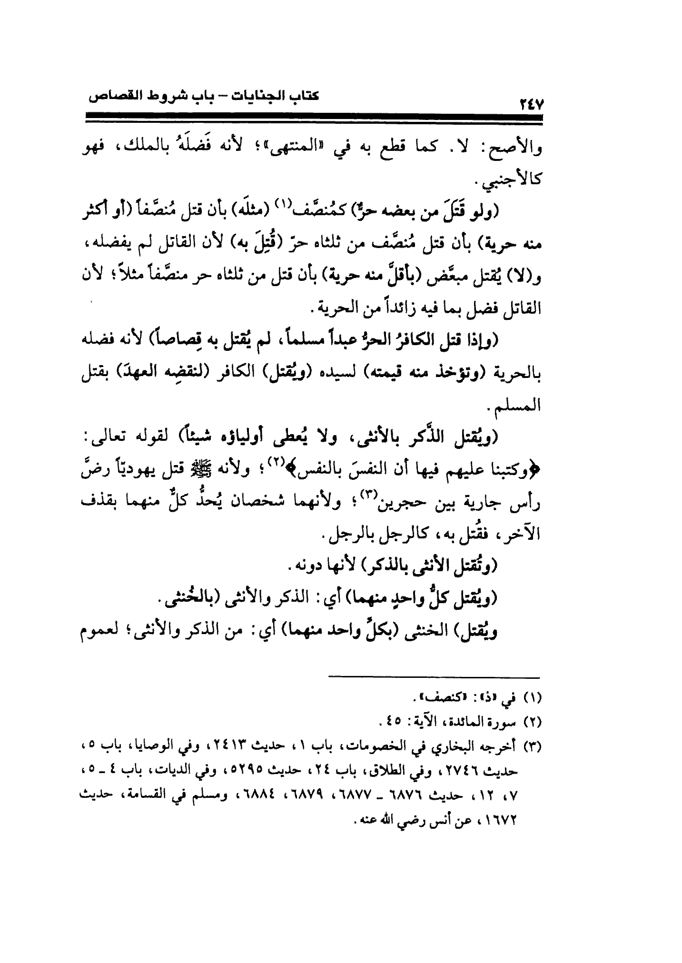 (ولو قَتَلَ من بعضه حرٌّ) كمُنصَّف (¬١) (مثلَه) بأن قتل مُنصَّفًا (أو أكثر منه حرية) بأن قتل مُنصَّف من ثلثاه حرّ (قُتِلَ به) لأن القاتل لم يفضله، و (لا) يُقتل مبعَّض (بأقلَّ منه حرية) بأن قتل من ثلثاه حر منصَّفًا مثلًا؛ لأن القاتل فضل بما فيه زائدًا من الحرية.