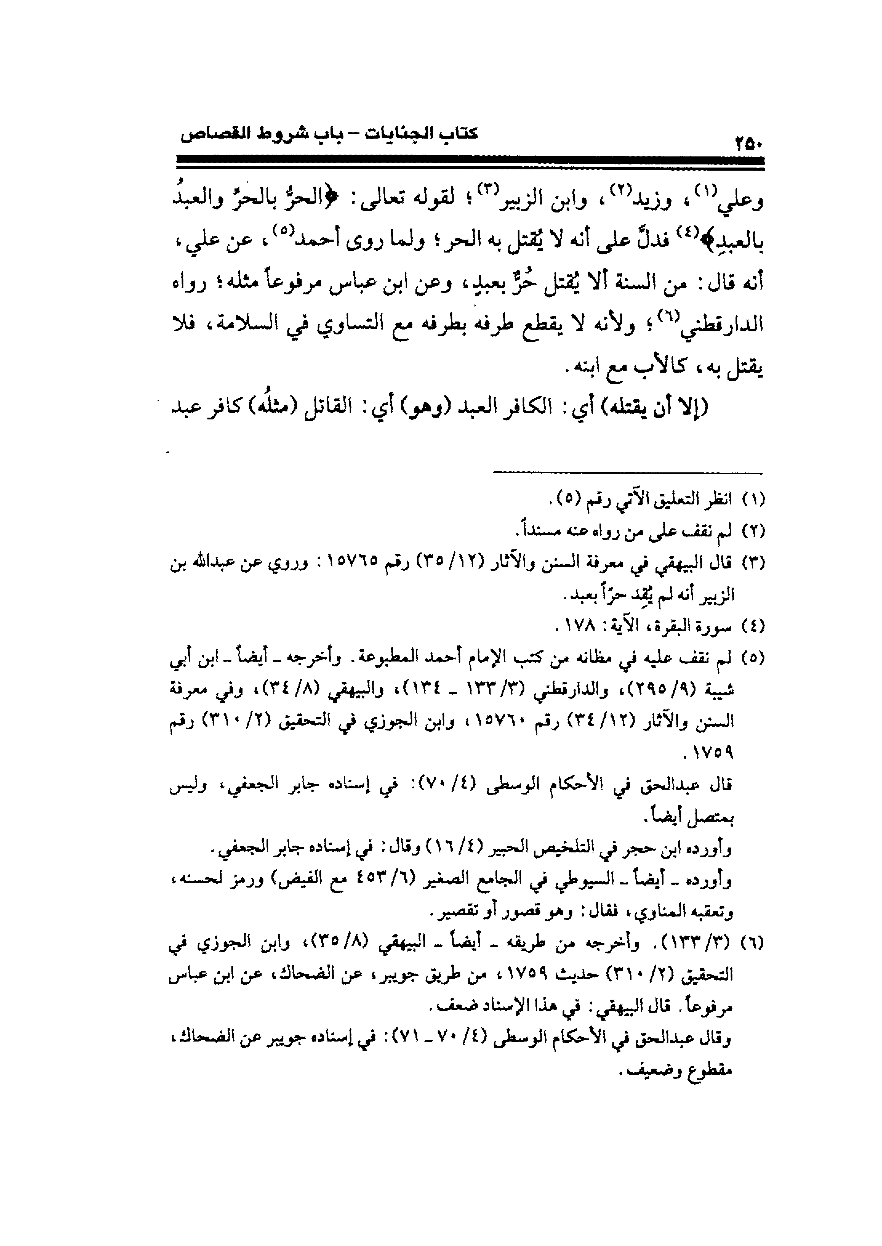 (¬٣) قال البيهقي في معرفة السنن والآثار (١٢/ ٣٥) رقم ١٥٧٦٥: وروي عن عبد الله بن الزُّبير أنَّه لم يُقِد حرًّا بعبد.