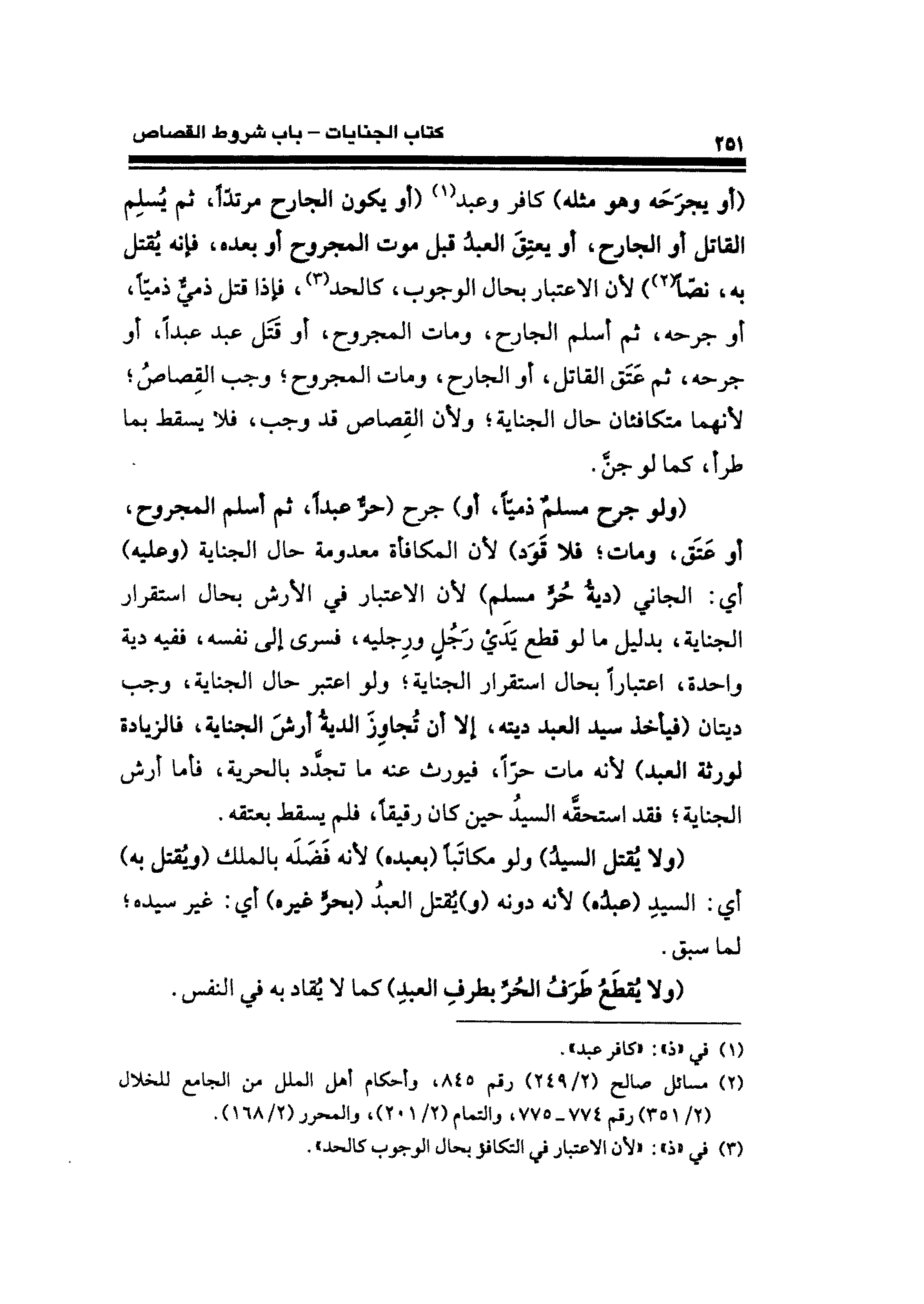 (أو يجرَحَه وهو مثله) كافر وعبد (¬١) (أو يكون الجارح مرتدًّا، ثم يُسلِم القاتل أو الجارح، أو يعتِقَ العبدُ قبل موت المجروح أو بعده، فإنه يُقتل به، نصًّا (¬٢)) لأن الاعتبار بحال الوجوب، كالحد (¬٣)، فإذا قتل ذميٌّ ذميًّا، أو جرحه، ثم أسلم الجارح، ومات المجروح، أو قتَل عبد عبدًا، أو جرحه، ثم عَتَق القاتل، أو الجارح، ومات المجروح؛ وجب القِصاصُ؛ لأنهما متكافئان حال الجناية؛ ولأن القِصاص قد وجب، فلا يسقط بما طرأ، كما لو جنَّ.