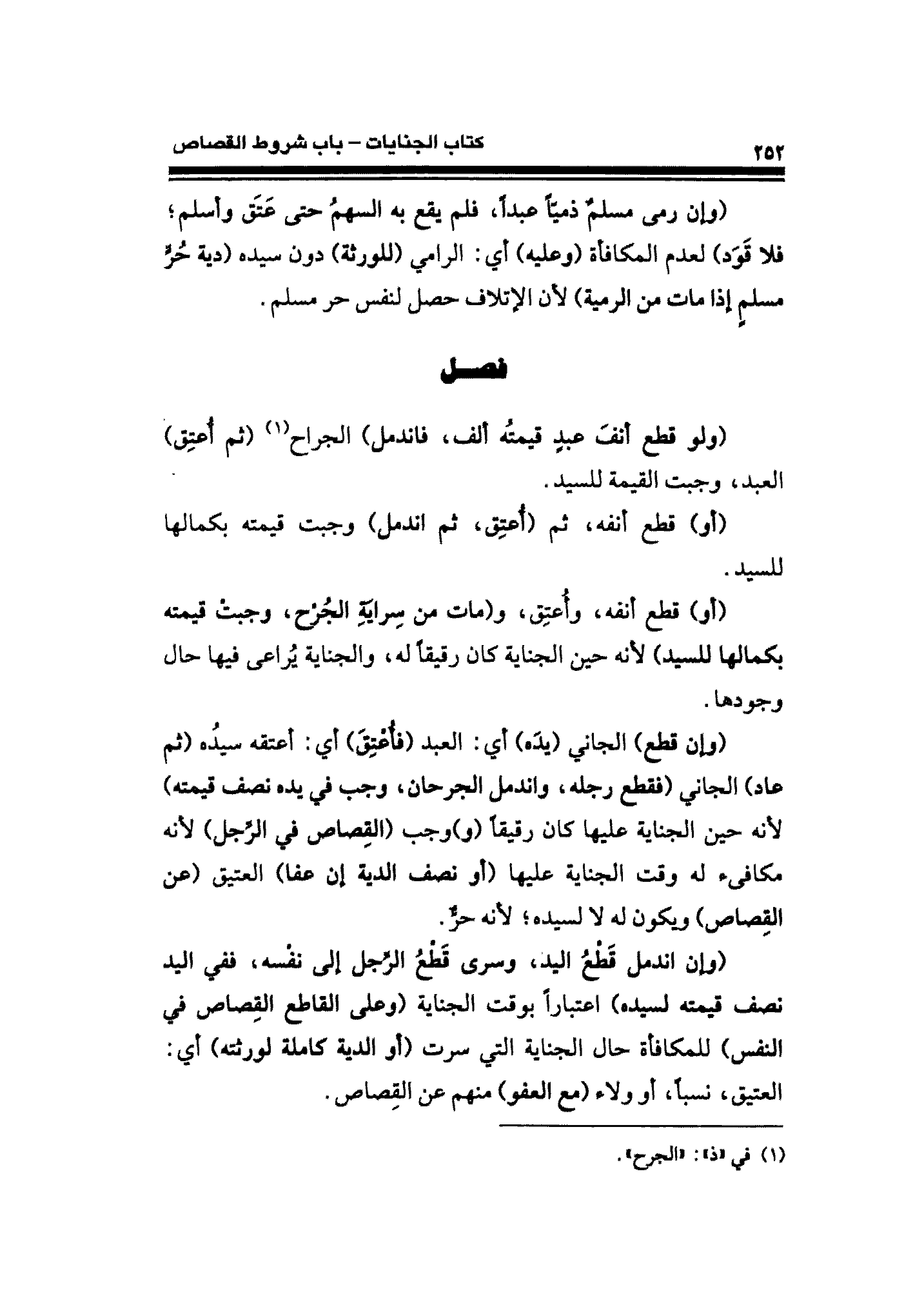 (وإن قطع) الجاني (يدَه) أي: العبد (فأُعْتِقَ) أي: أعتقه سيدُه (ثم عاد) الجاني (فقطع رجله، واندمل الجرحان، وجب في يده نصف قيمته) لأنه حين الجناية عليها كان رقيقًا (و) وجب (القِصاص في الرِّجل) لأنه مكافئ له وقت الجناية عليها (أو نصف الدية إن عفا) العتيق (عن القِصاص) ويكون له لا لسيده؛ لأنه حرٌّ.