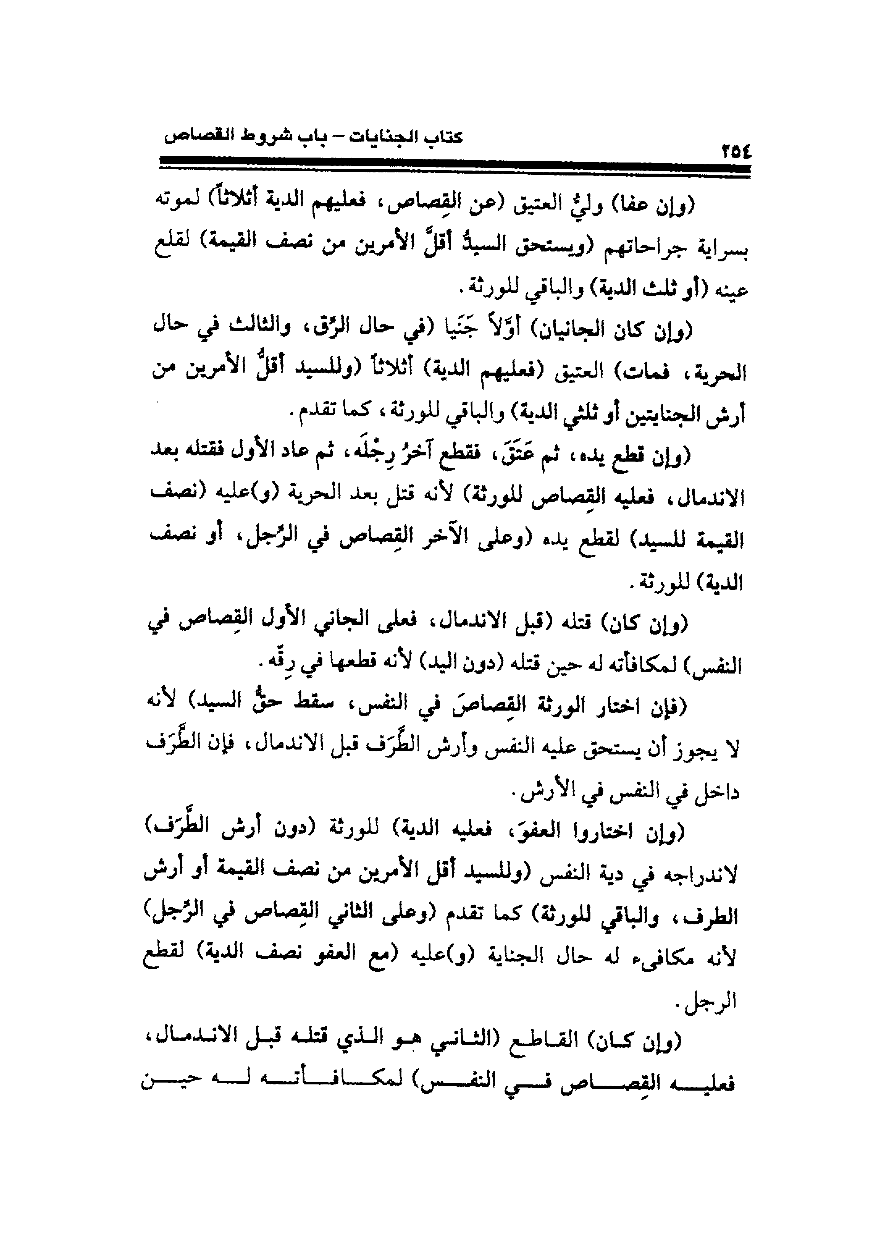 (فإن اختار الورثة القِصاصَ في النفس، سقط حقُّ السيد) لأنه لا يجوز أن يستحق على النفس وأرش الطَّرَف قبل الاندمال، فإن الطَّرَف داخل في النفس في الأرش.