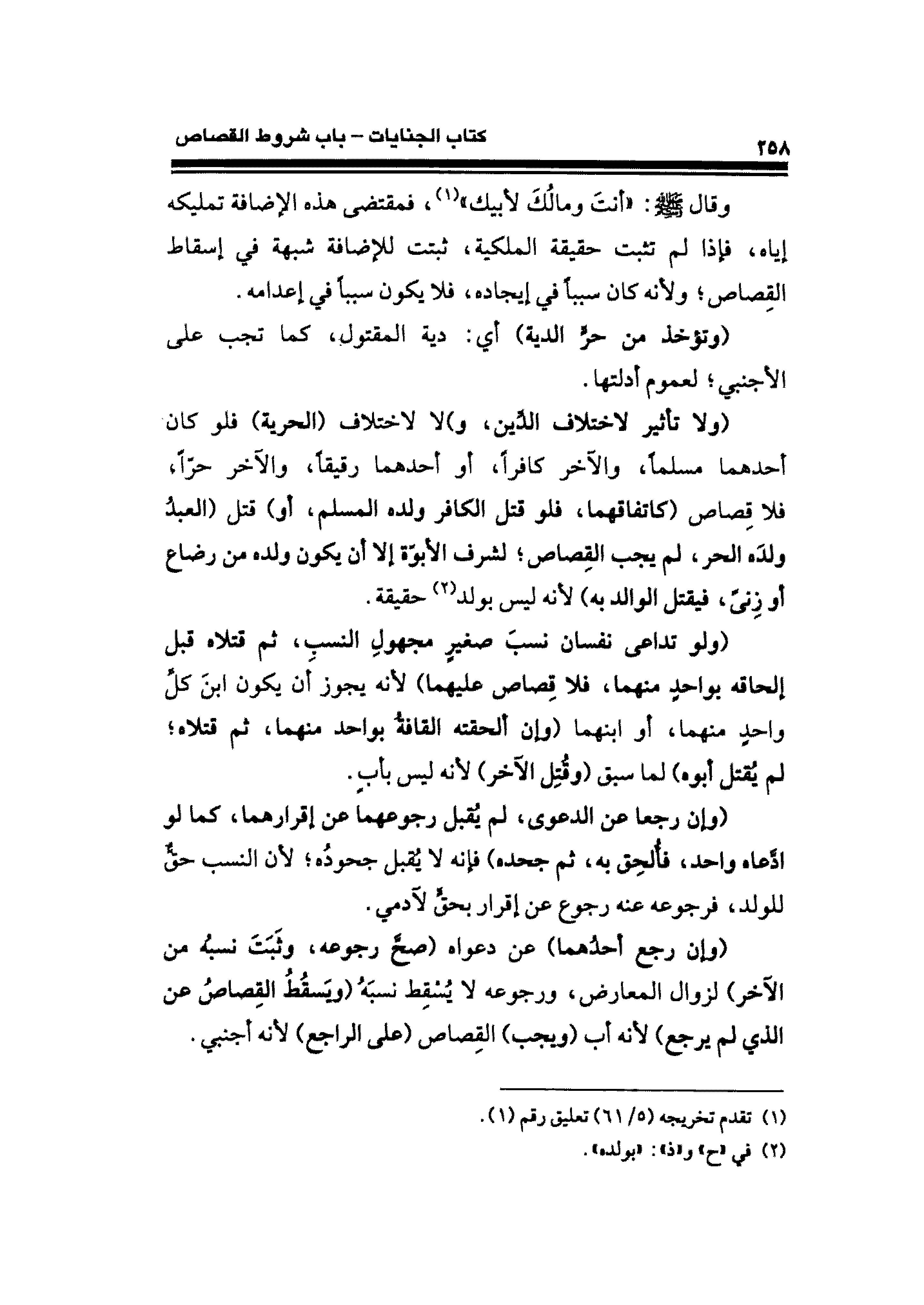 وقال - صلى الله عليه وسلم -: "أنت ومالُكَ لأبيك" (¬١)، فمقتضى هذه الإضافة تمليكه إياه، فإذا لم تثبت حقيقة الملكية، ثبتت للإضافة شبهة في إسقاط القِصاص؛ ولأنه كان سببًا في إيجاده، فلا يكون سببًا في إعدامه.