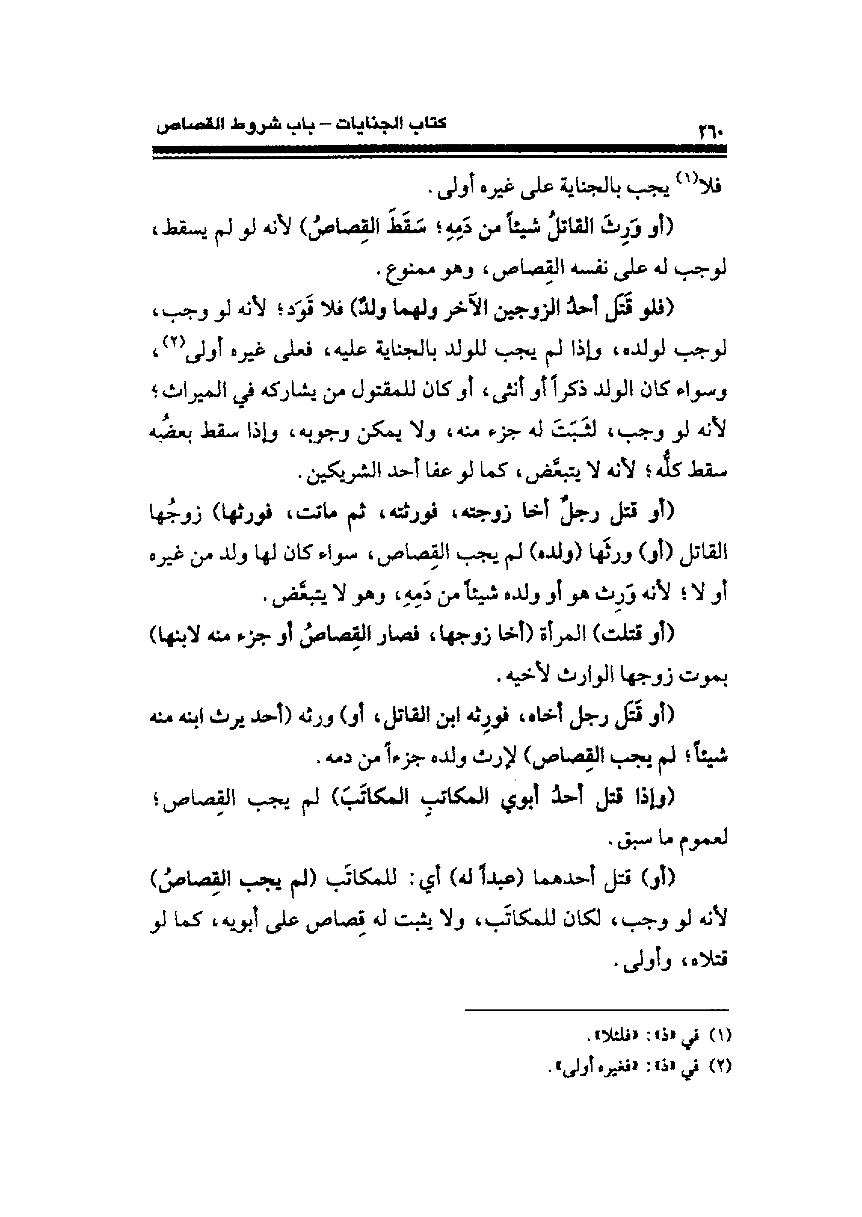 (فلو قَتَل أحدُ الزوجين الآخر ولهما ولدٌ) فلا قَوَد؛ لأنه لو وجب، لوجب لولده، وإذا لم يجب للولد بالجناية عليه، فعلى غيره أولى (¬٢)، وسواء كان الولد ذكرًا أو أنثى، أو كان للمقتول من يشاركه في الميراث؛ لأنه لو وجب، لثَبتَ له جزء منه، ولا يمكن وجويه، وإذا سقط بعضُه سقط كلُّه؛ لأنه لا يتبعَّض، كما لو عفا أحد الشريكين.