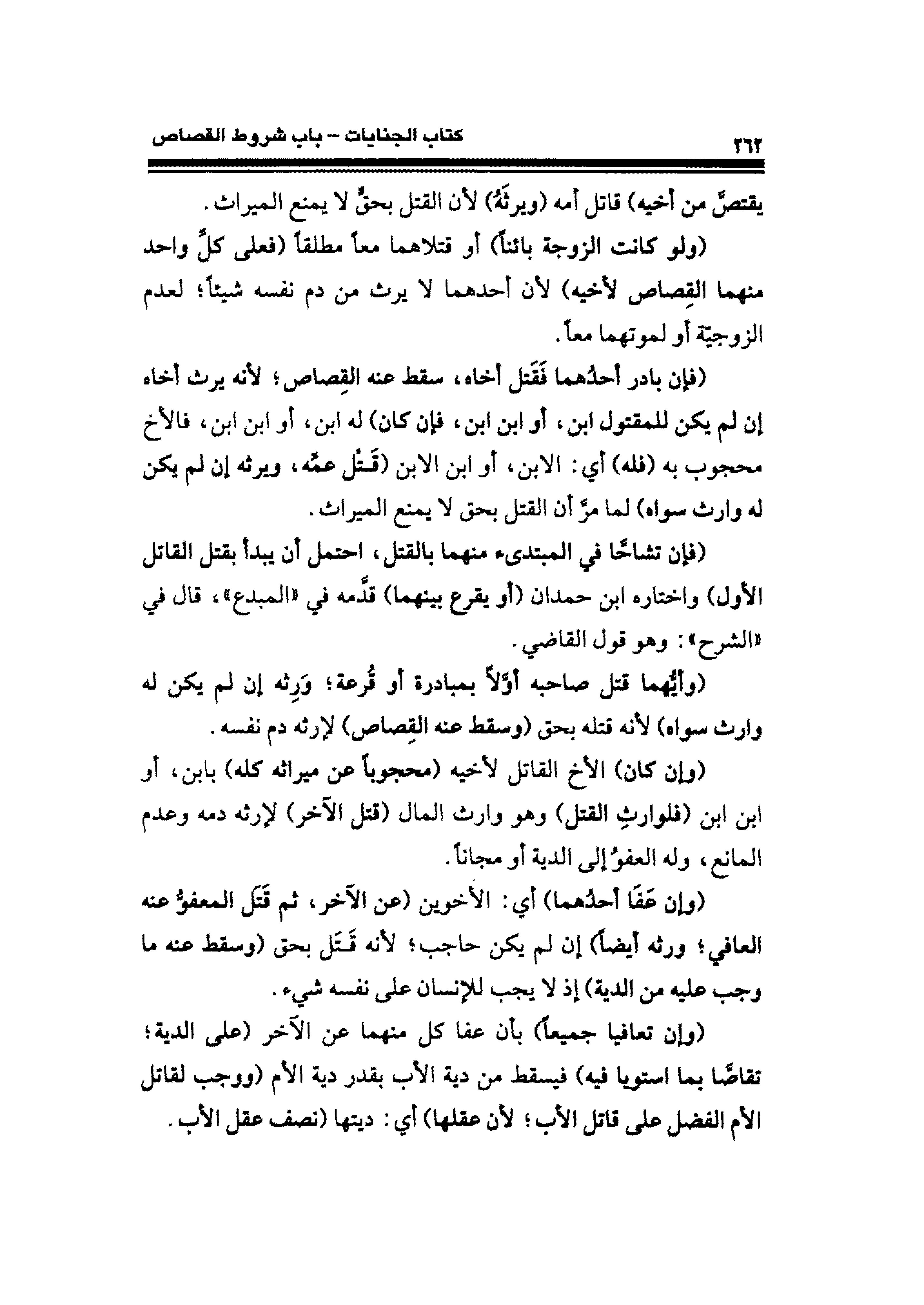 (فإن بادر أحدُهما فَقَتل أخاه، سقط عنه القِصاص؛ لأنه يرث أخاه إن لم يكن للمقتول ابن، أو ابن ابن، فإن كان) له ابن، أو ابن ابن، فالأخ محجوب به (فله) أي: الابن، أو ابن الابن (قَتْل عمِّه، ويرثه إن لم يكن له وارث سواه) لما مرَّ أن القتل بحق لا يمنع الميراث.