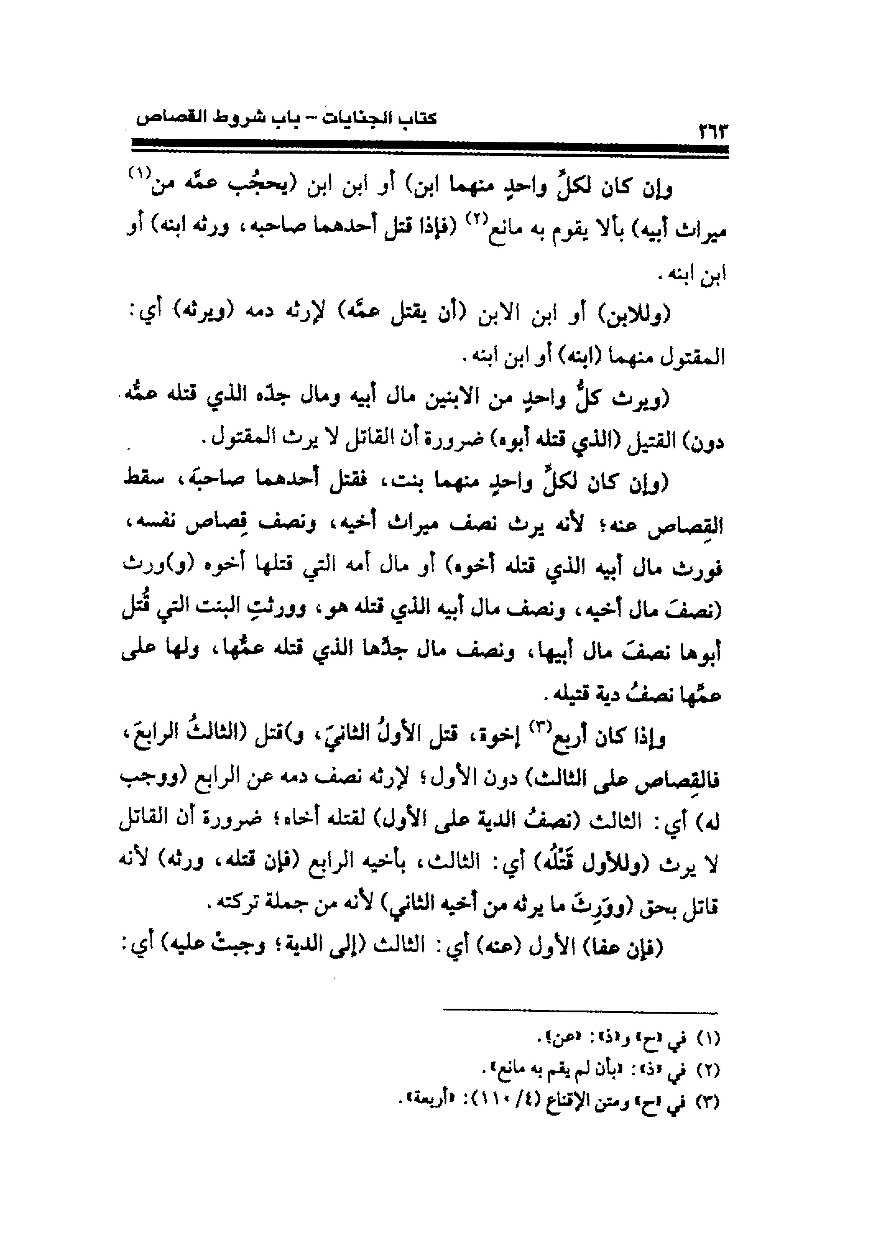 وإذا كان أربع (¬٣) إخوة، قتل الأولُ الثانيَ، و) قتل (الثالث الرابعَ، فالقِصاص على الثالث) دون الأول؛ لإرثه نصف دمه عن الرابع (ووجب له) أي: الثالث (نصفُ الدية على الأول) لقتله أخاه؛ ضرورة أن القاتل لا يرث (وللأول قَتْلُه) أي: الثالث، بأخيه الرابع (فإن، ورثه) لأنه قاتل بحق (ووَرِثَ ما يرثه من أخيه الثاني) لأنه من جملة تركته.
