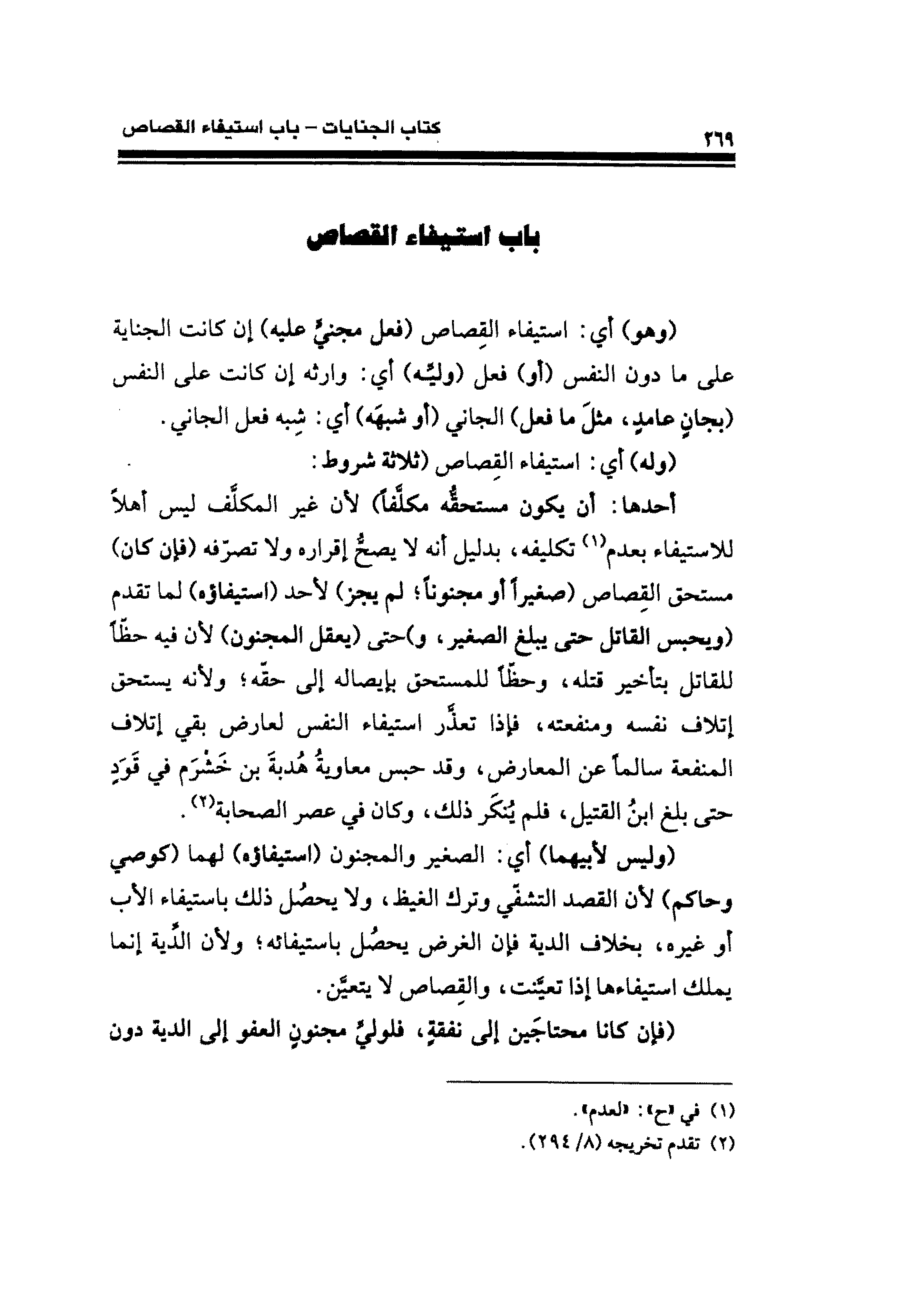 أحدها: أن يكون مستحقُّه مكلَّفًا) لأن غير المكلَّف ليس أهلًا للاستيفاء بعدم (¬١) تكليفه، بدليل أنه لا يصحُّ إقراره ولا تصرّفه (فإن كان) مستحق القِصاص (صغيرًا أو مجنونًا؛ لم يجز) لأحد (استيفاؤه) لما تقدم (ويحبس القاتل حتى يبلغ الصغير، و) حتى (يعقل المجنون) لأن فيه حظًّا للقاتل بتأخير قتله، وحظًّا للمستحق بإيصاله إلى حقّه؛ ولأنه يستحق إتلاف نفسه ومنفعته، فإذا تعذَّر استيفاء النفس لعارض بقي إتلاف المنفعة سالمًا عن المعارض، وقد حبس معاويةُ هُدبةَ بن خَشْرَم في قَوَدٍ حتى بلغ ابنُ القتيل، فلم يُنكَر ذلك، وكان في عصر الصحابة (¬٢).