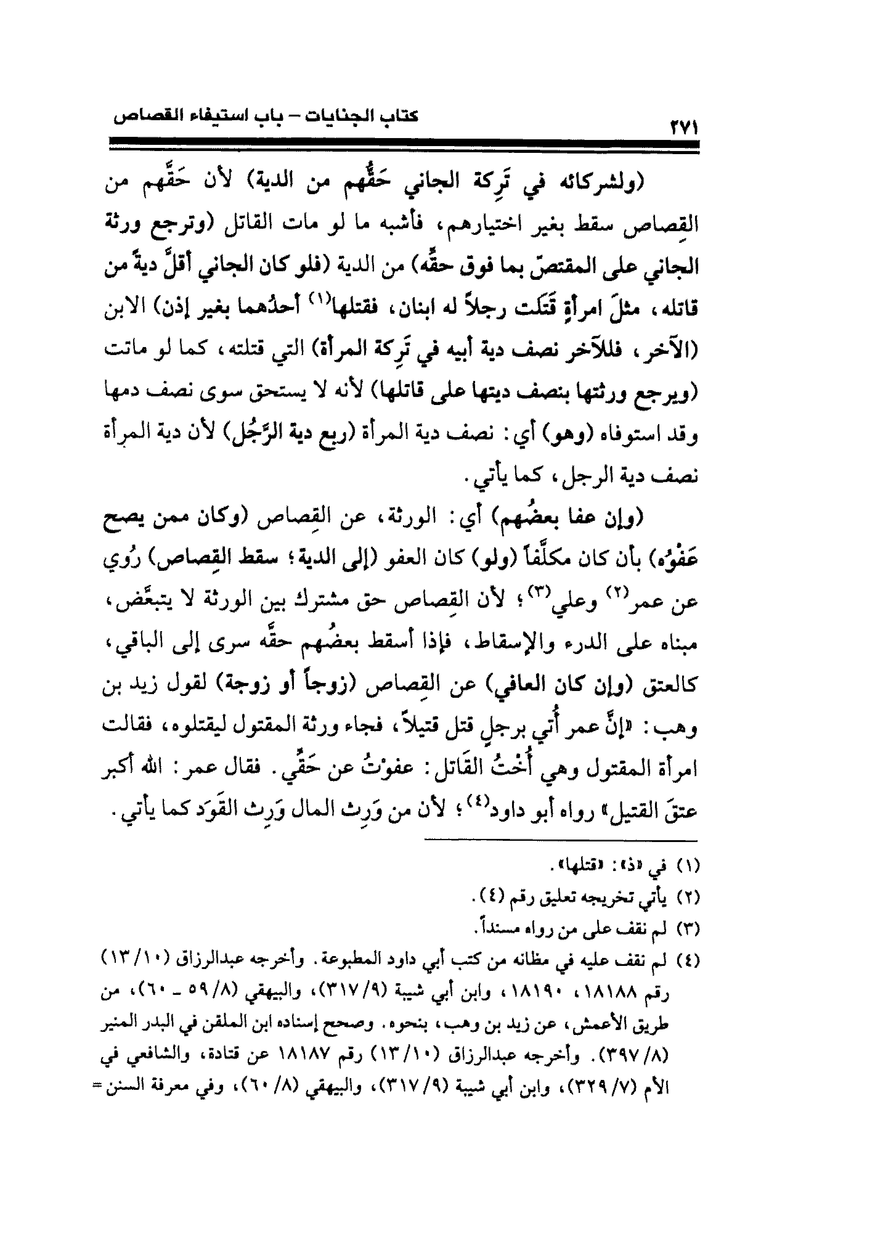 (¬٤) لم نقف عليه في مظانه من كتب أبي داود المطبوعة. وأخرجه عبد الرزاق (١٠/ ١٣) رقم ١٨١٨٨، ٥١٨١٩٠ وابن أبي شيبة (٩/ ٣١٧) البيهقي (٨/ ٥٩ - ٦٠)، من طريق الأعمش، عن زيد بن وهب، بنحوه. وصحح إسناده ابن الملقن في البدر المنير (٨/ ٣٩٧). وأخرجه عبد الرزاق (١٠/ ١٣) رقم ١٨١٨٧ عن قتادة، والشافعي في الأم (٧/ ٣٢٩)، وابن أبى شيبة (٩/ ٣١٧)، والبيهقي (٨/ ٦٠)، وفي معرفة السنن=